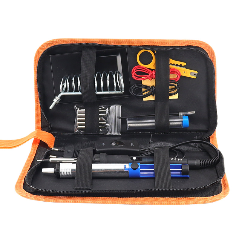 - 【中规带开关15件套】908S烙铁+5支头+海绵+笔焊丝+弯镊+蓝吸锡器+A烙铁架+剥线刀+2线+包