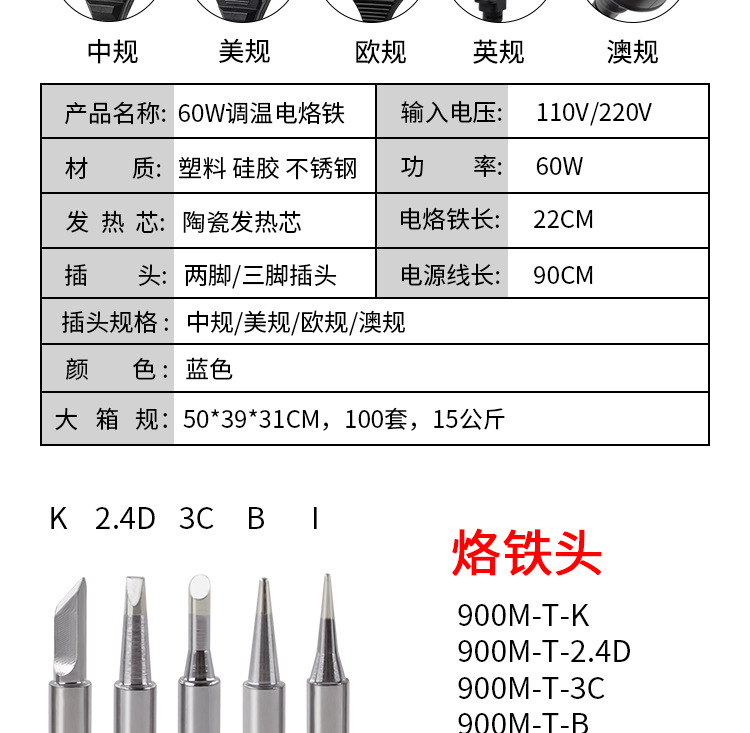 - 【9件套】澳规60W/220V906烙铁+5支烙铁头+Y烙铁架+海绵+8g锡线