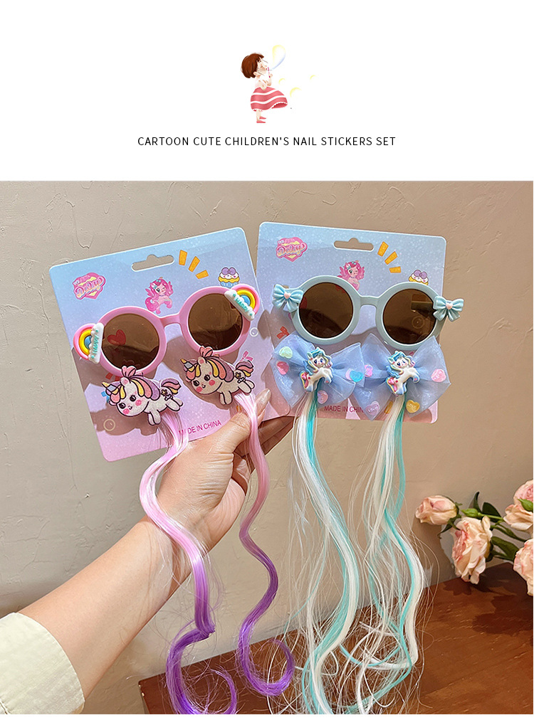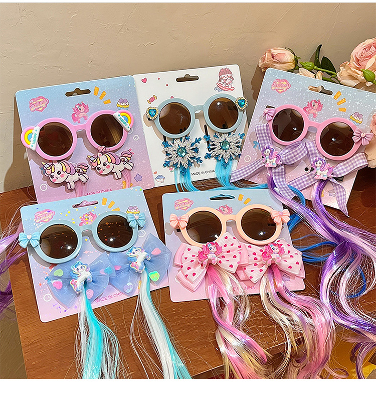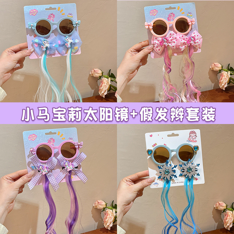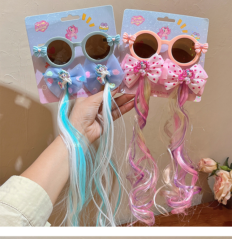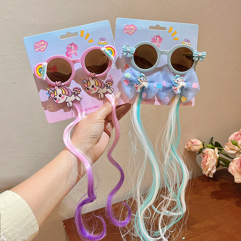 儿童墨镜夏季新款库洛米假发辫子卡通女童发夹太阳镜宝宝眼镜