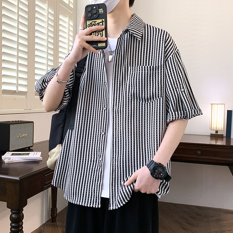 夏季经典竖条纹短袖衬衫男沙滩休闲度假男衬衣潮流发型师痞帅