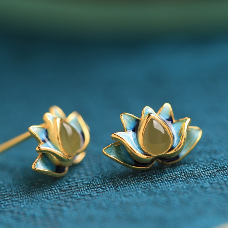莲花和田玉纯银耳钉女夏天季新中式国风珐琅景泰蓝色古风耳饰耳环
