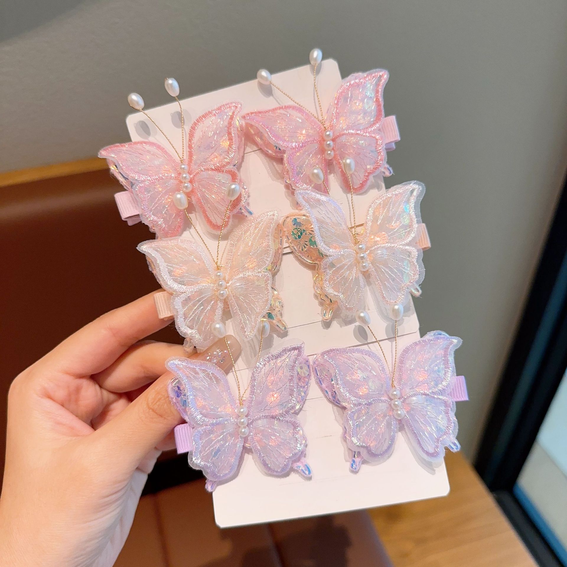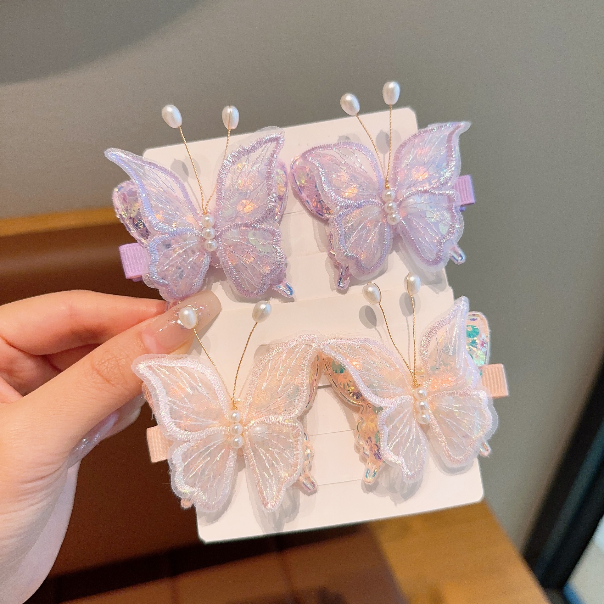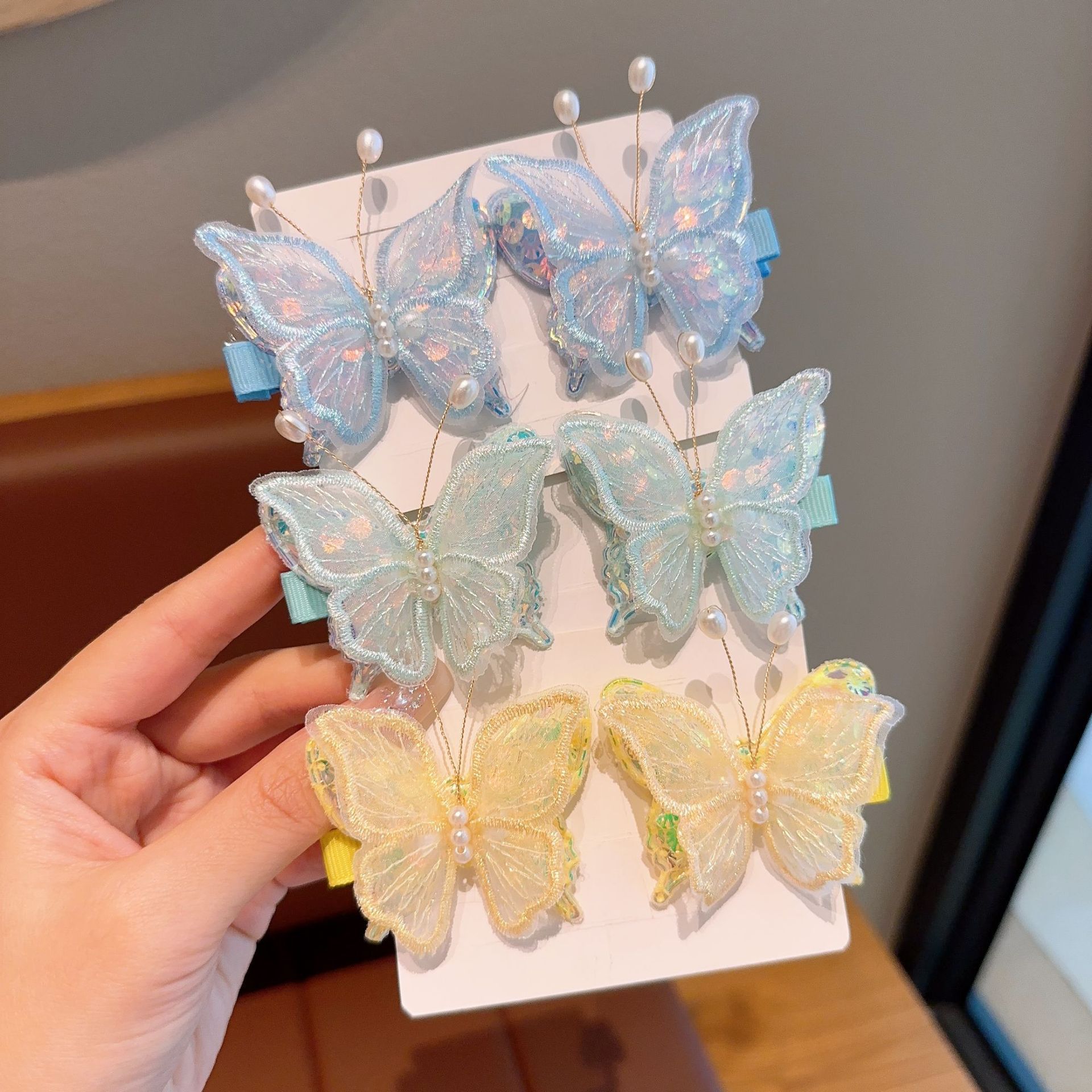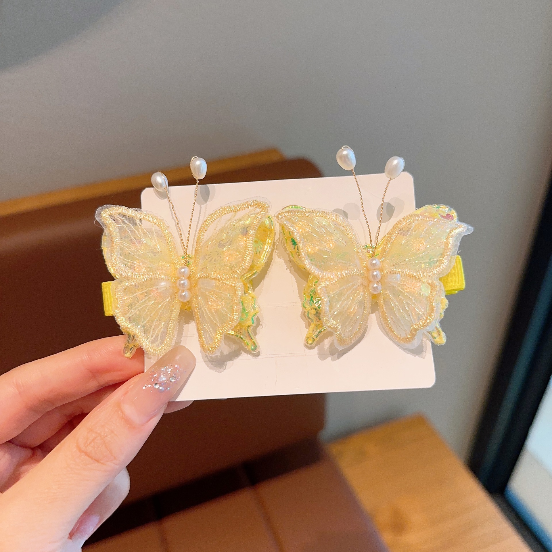 新款双层网纱珍珠蝴蝶边夹侧边刘海发夹小女孩碎发头饰超仙发饰女