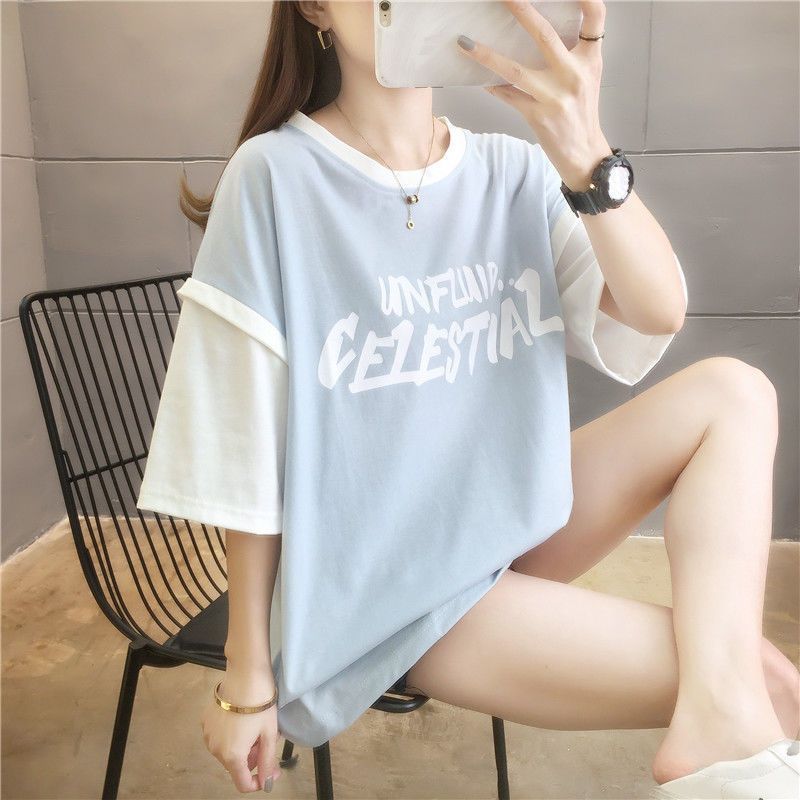 新款假两件港风半袖t恤原宿风女学生夏季韩版宽松五分袖ins潮