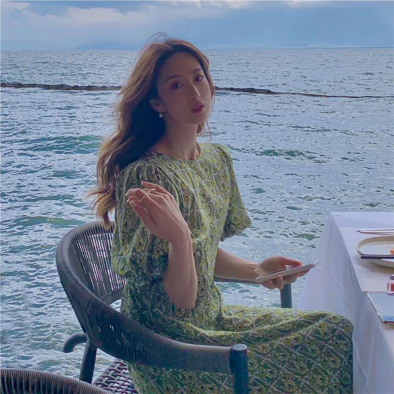 绿色碎花高级感夏季连衣裙女韩版小个子法式收腰泡泡袖宽松长款裙