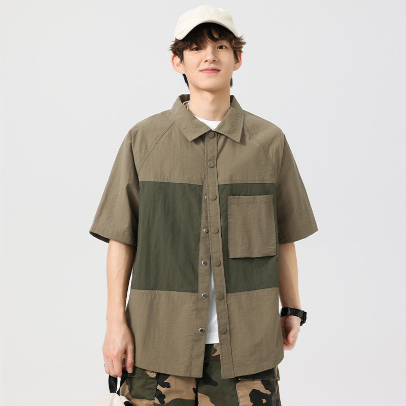 高端山系拼接撞色工装短袖衬衫男士夏季宽松日系复古潮牌衬衣