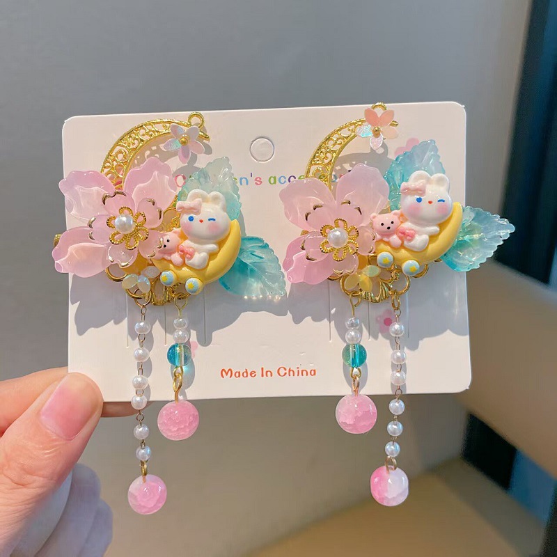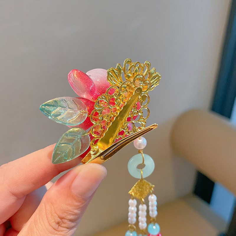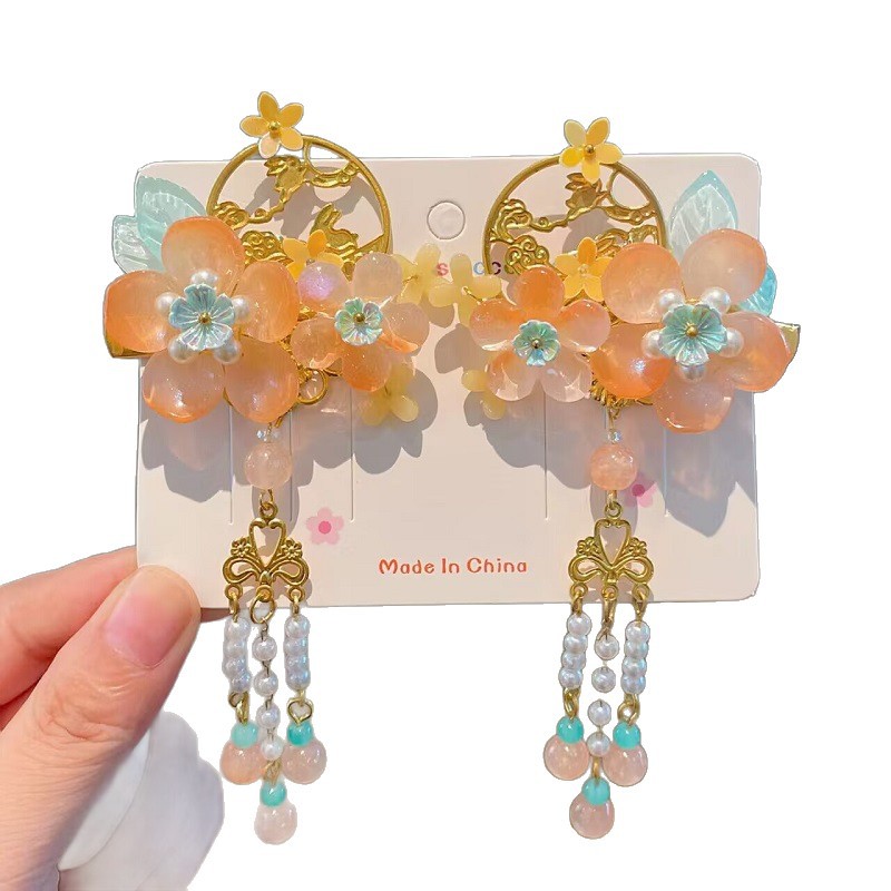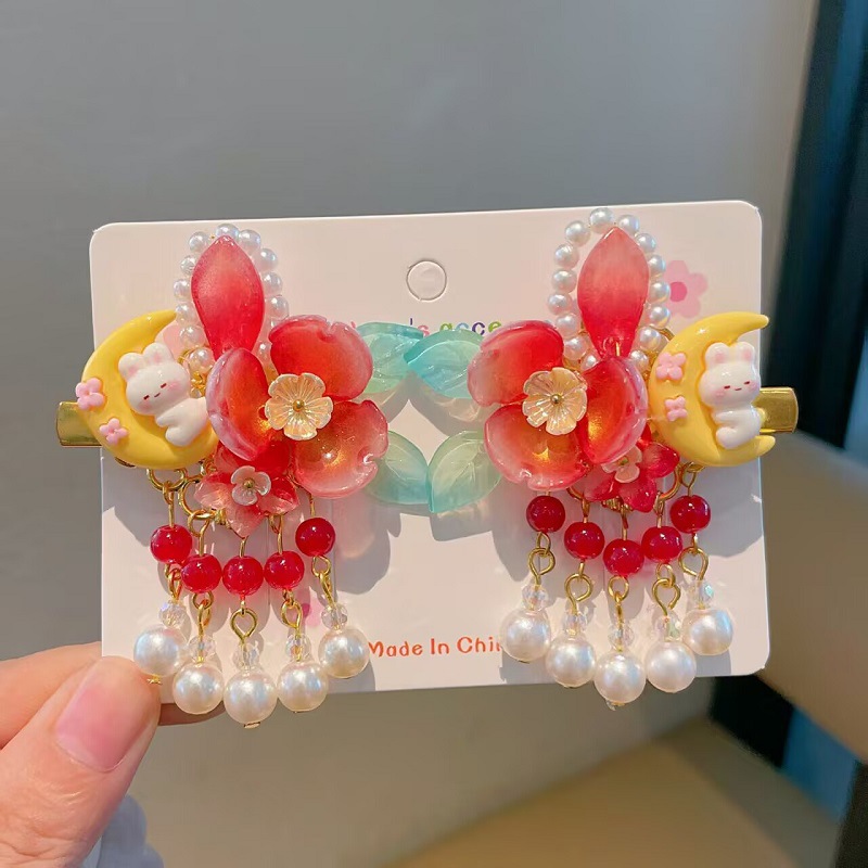 儿童古风发饰红色发夹流苏对夹中国风花朵汉服发夹小女孩中秋头饰