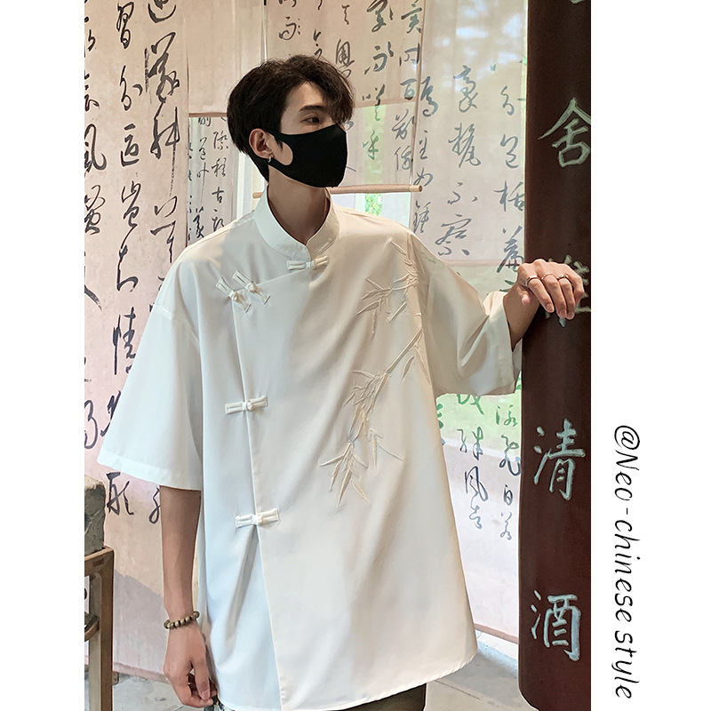 新中式盘扣短袖衬衫男夏季冰丝竹子刺绣衬衣宽松设计感中国风上衣