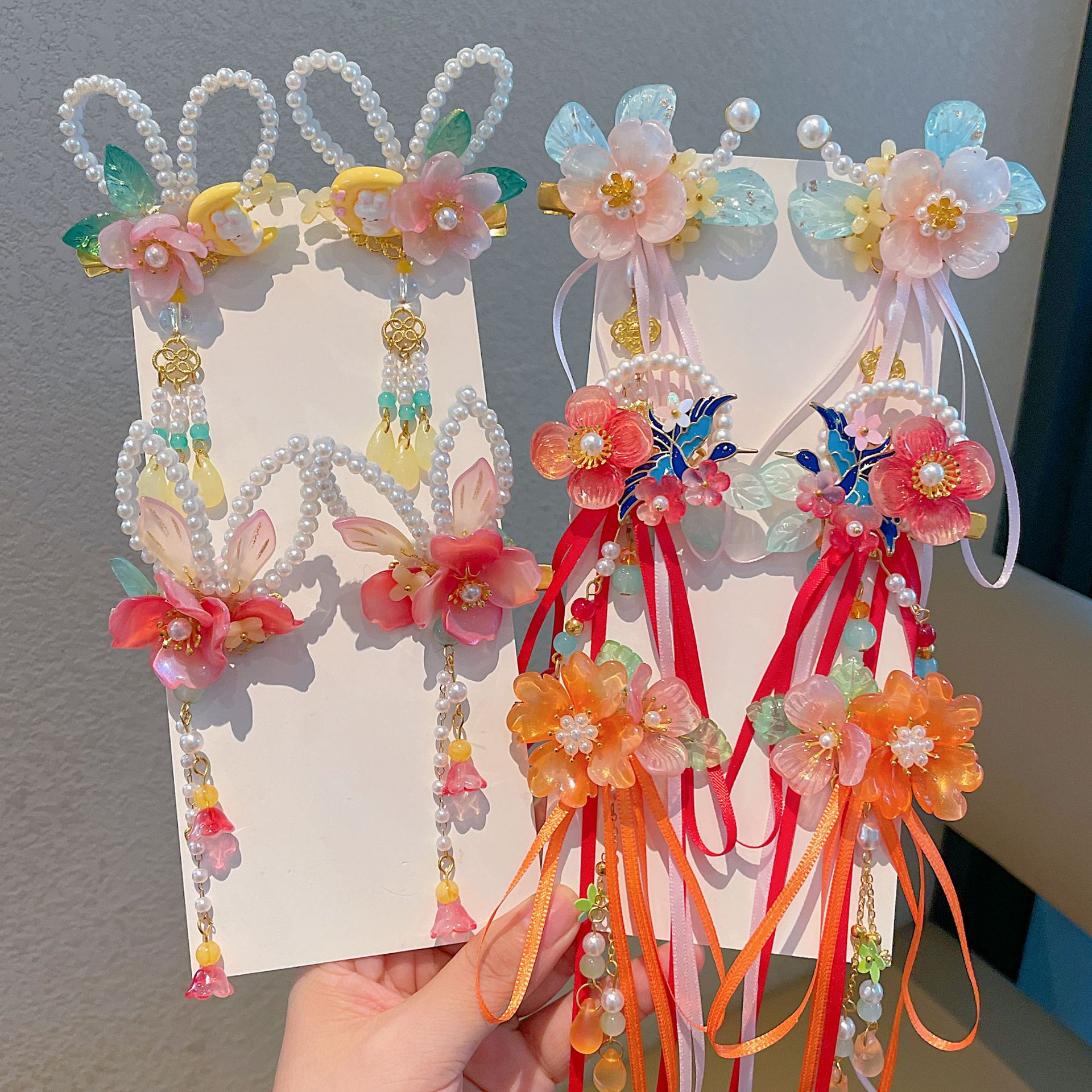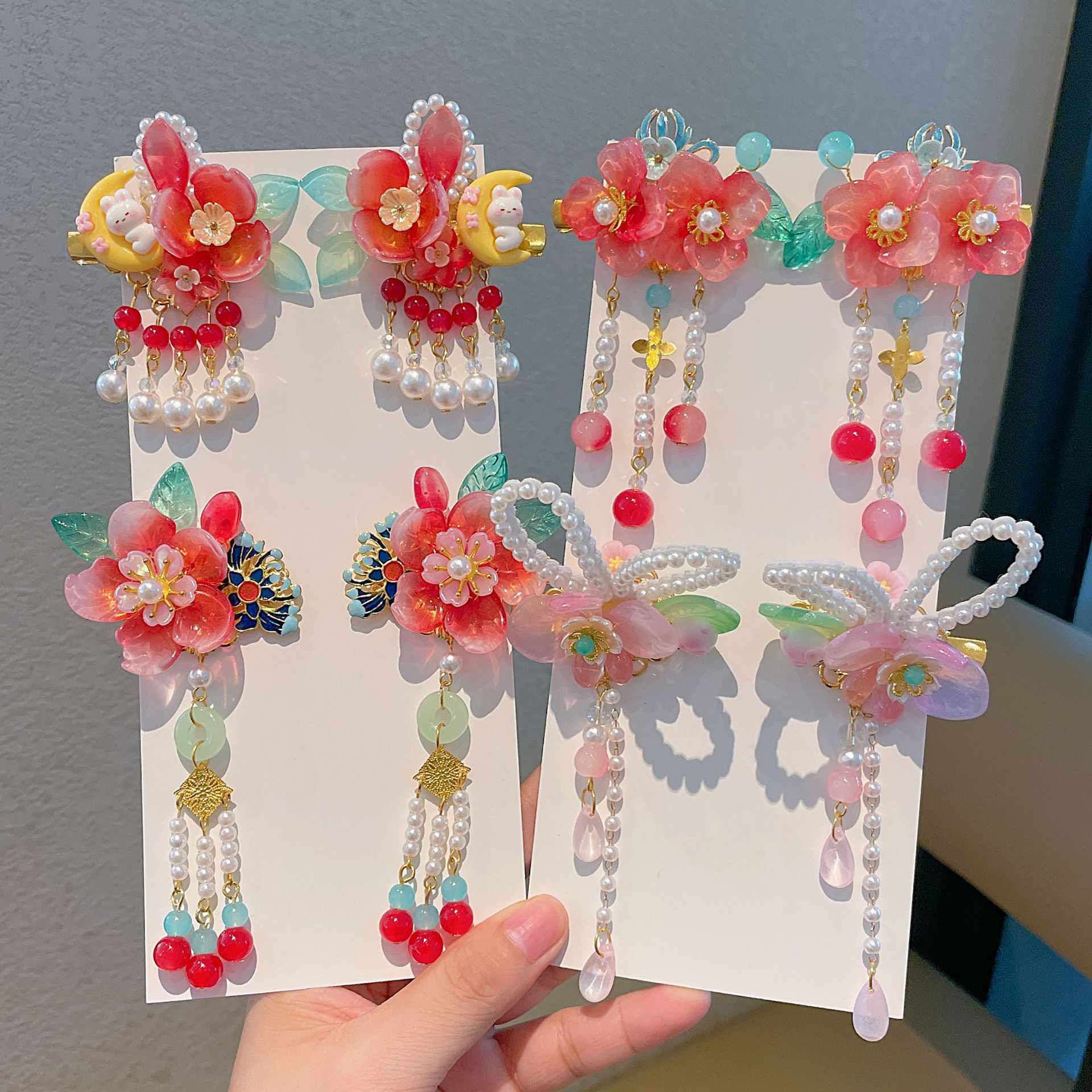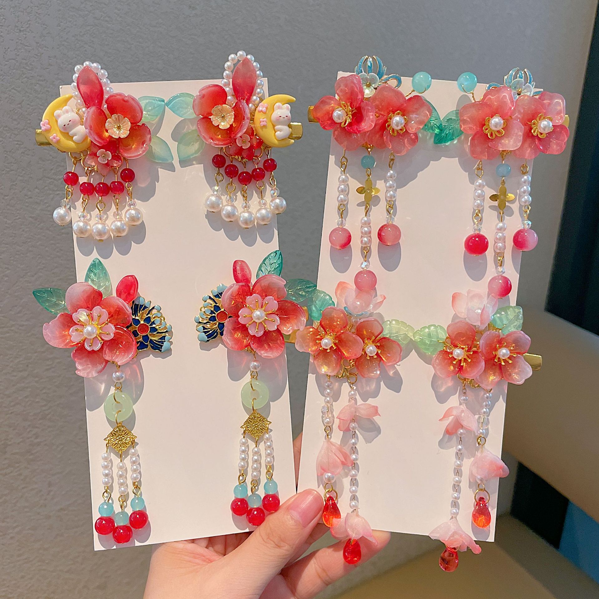 汉服头饰女儿童古风花朵流苏发夹女孩古装中国风发卡公主流苏对夹