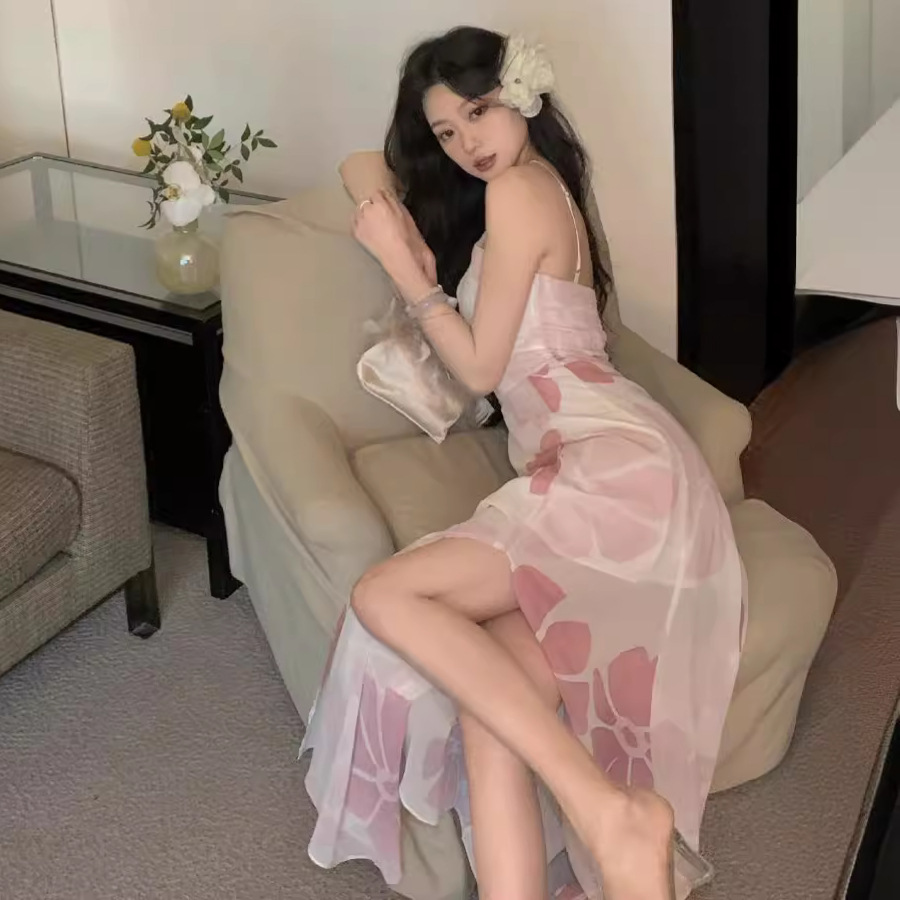 挂脖印花吊带连衣裙春季新款女装雪纺开叉露背裙子粉色海岛裙
