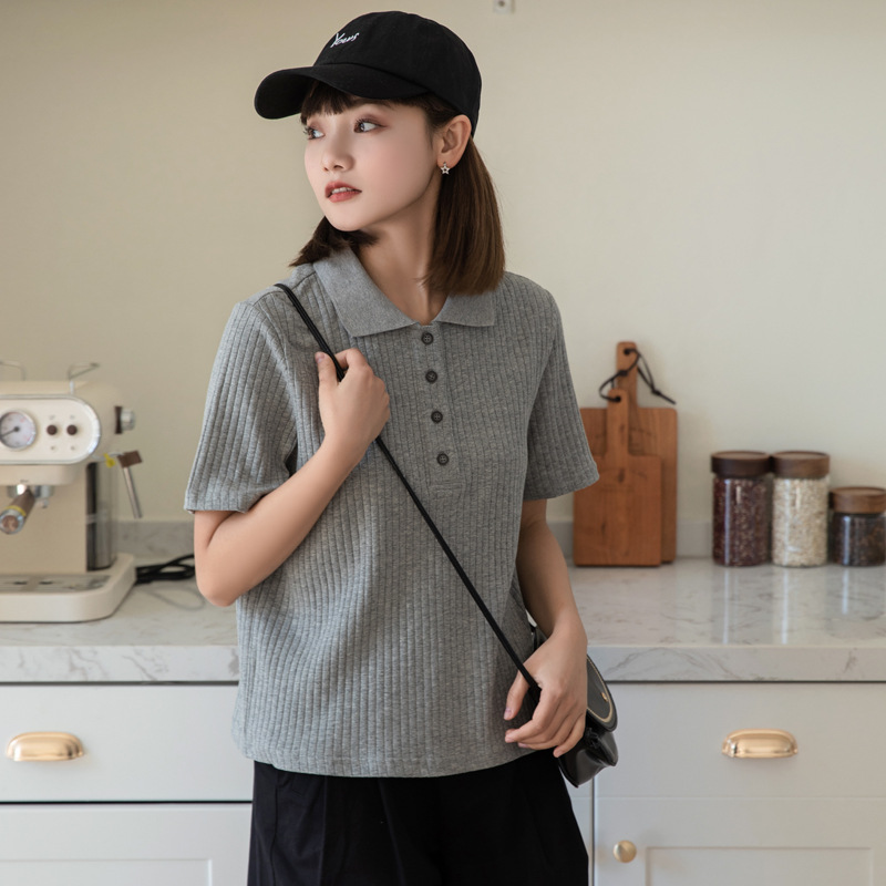 POLO领条纹针织衫短袖女夏季新款日系休闲宽松POLO衫上衣