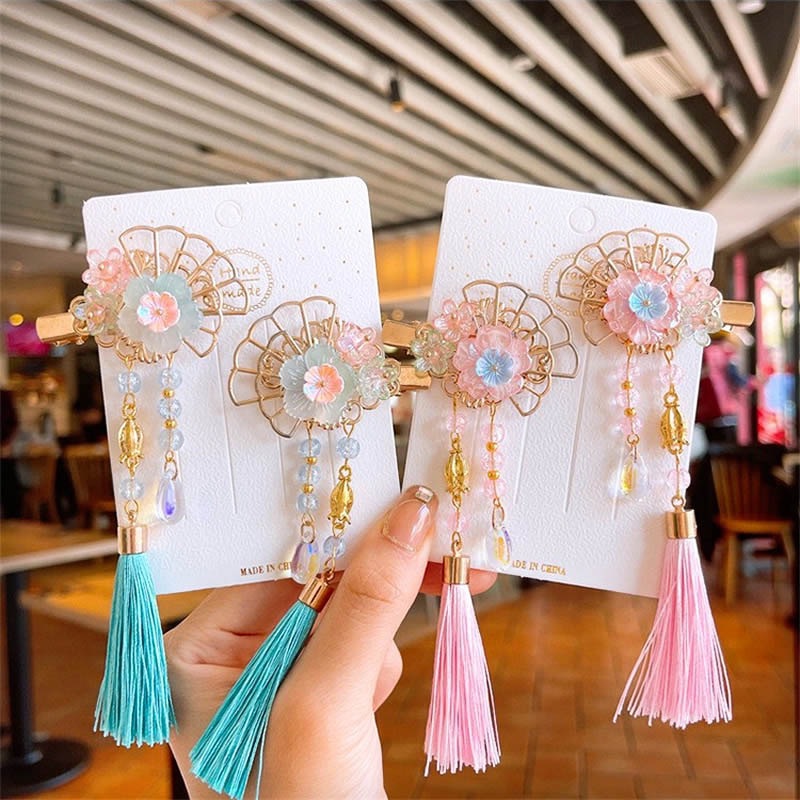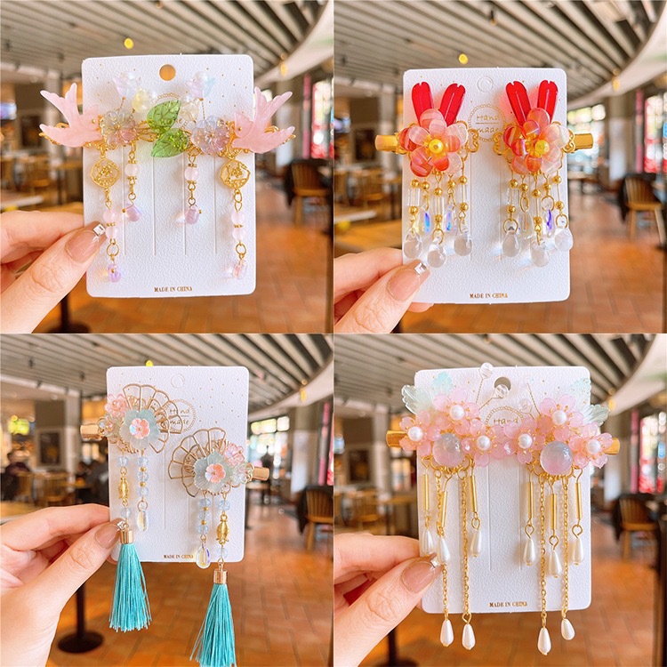 儿童古风发饰红色发夹流苏对夹中国风花朵汉服发夹小女孩中秋头饰