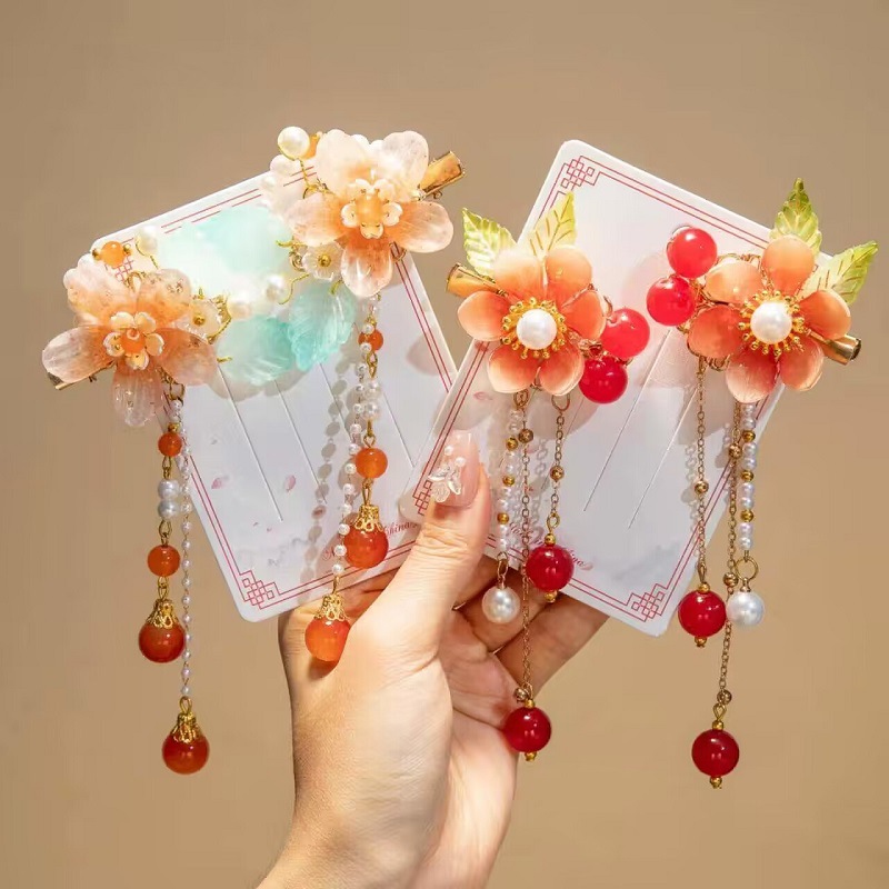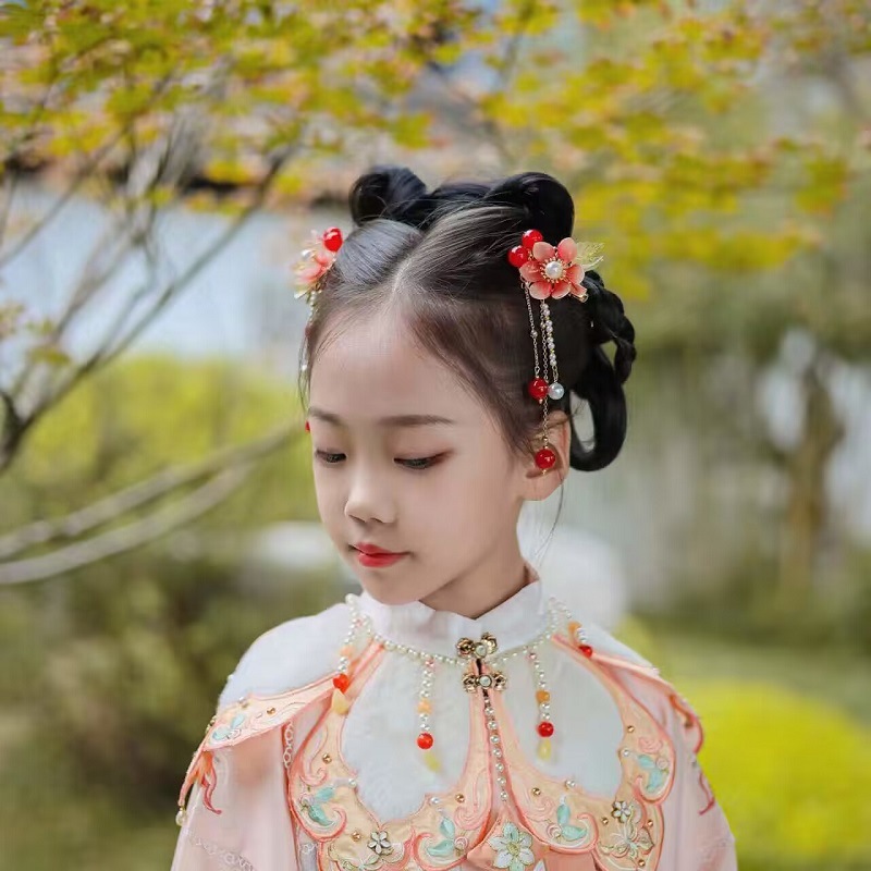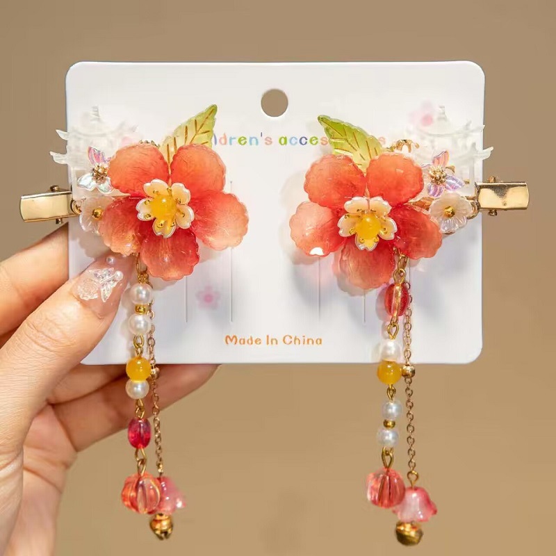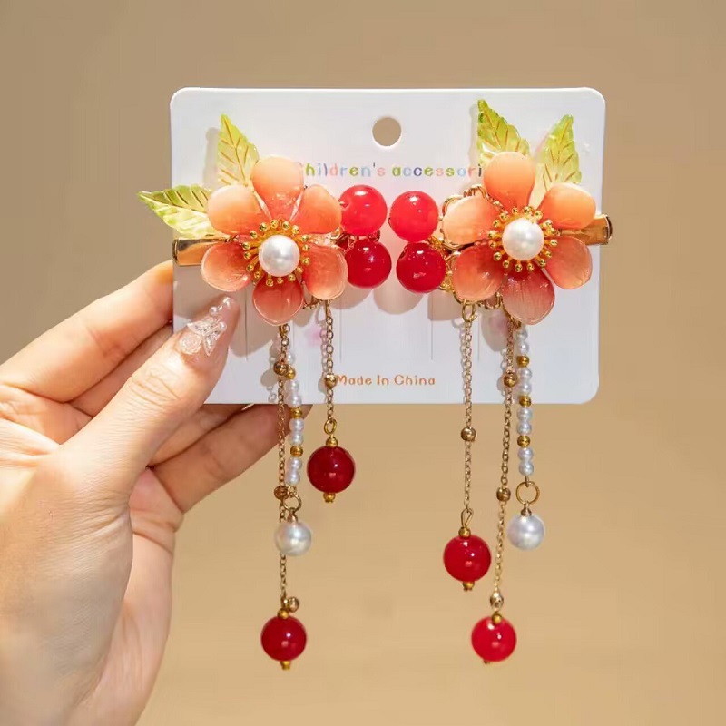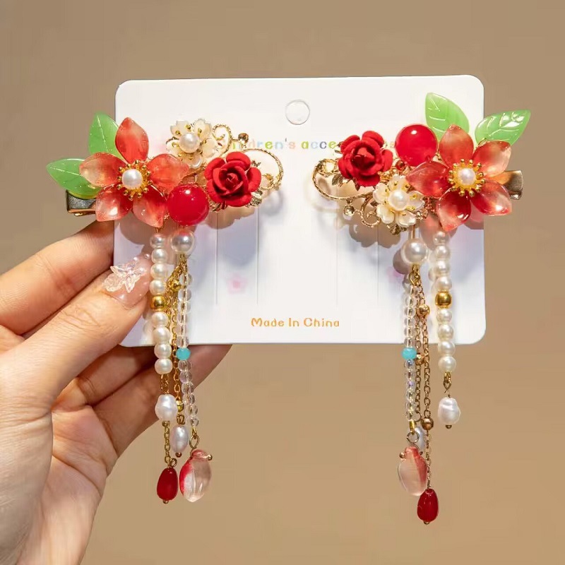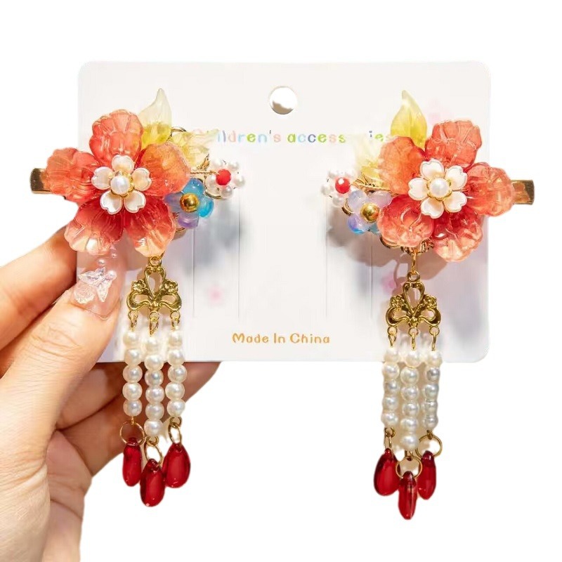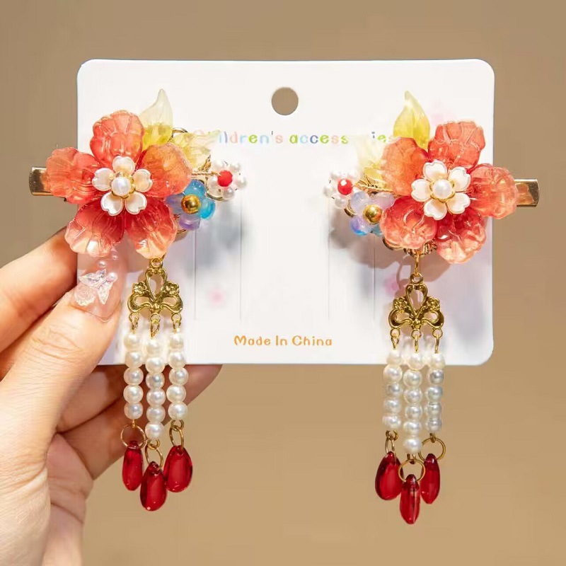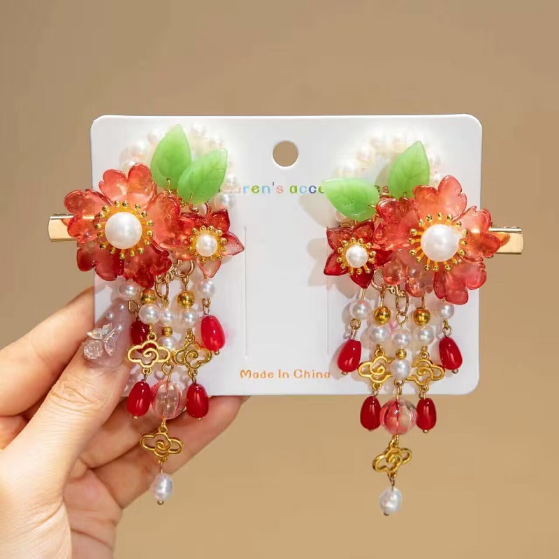新款红色中国风汉服头饰儿童古风流苏发夹琉璃发卡喜庆新年发饰品