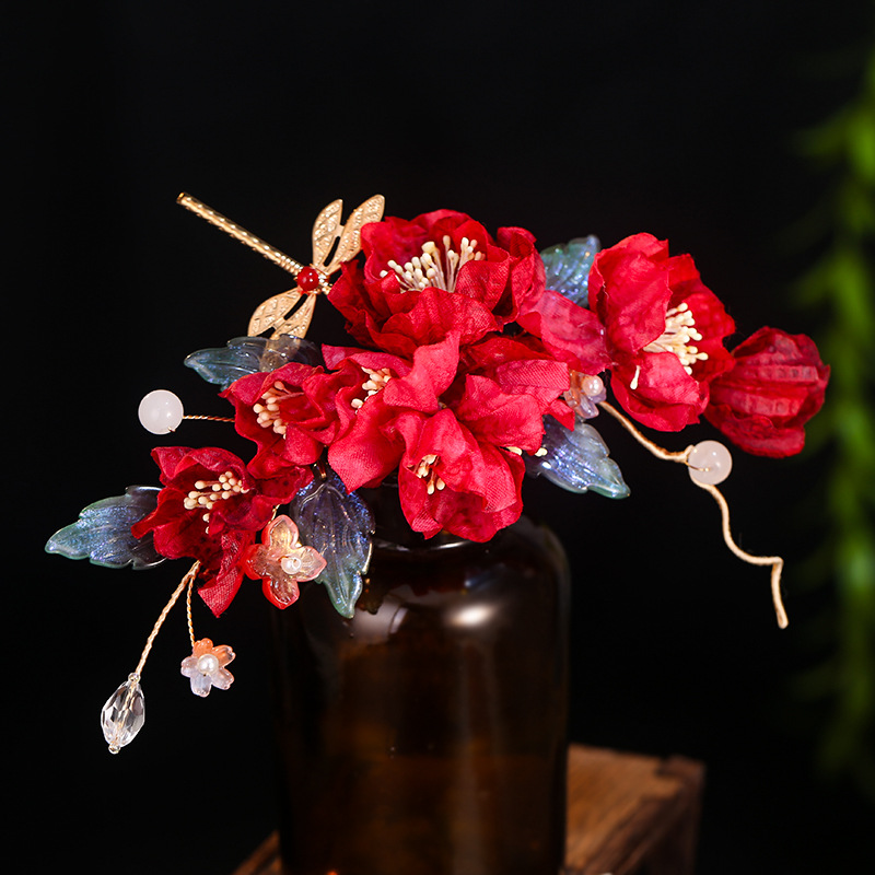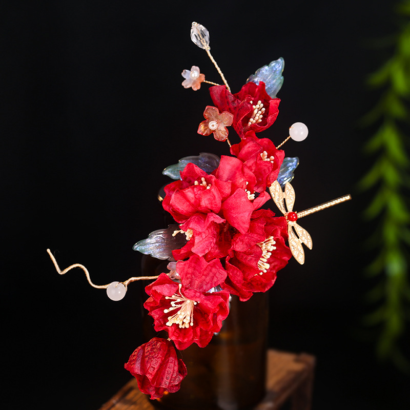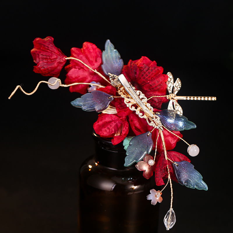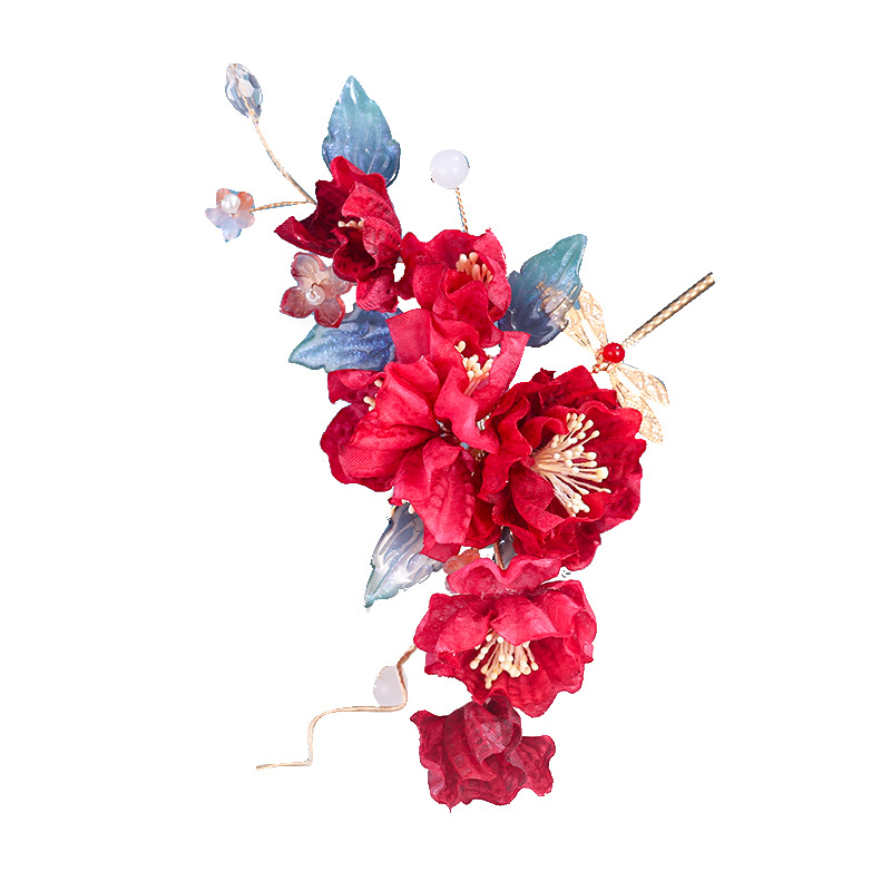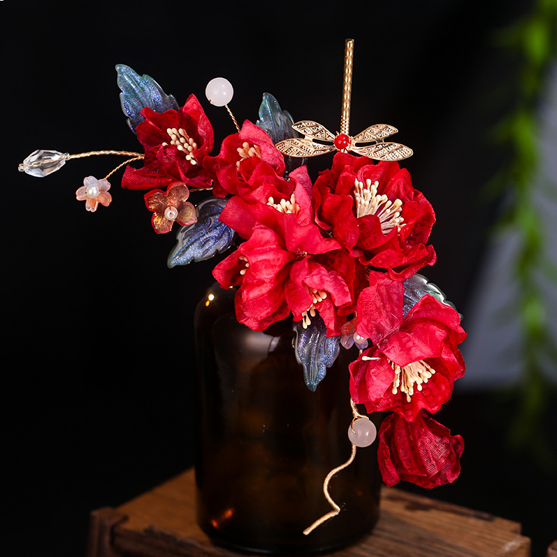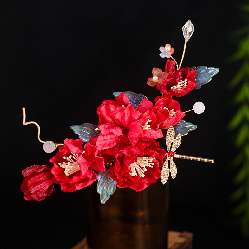 汉服发饰古风红色新娘结婚绢花发夹头饰森系花朵边夹配饰
