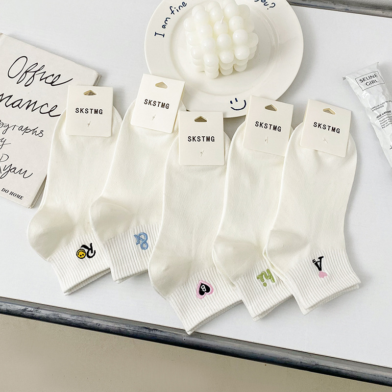 袜子女春夏白色刺绣字母女船袜潮流短筒女生R笑脸女袜夏季短袜棉