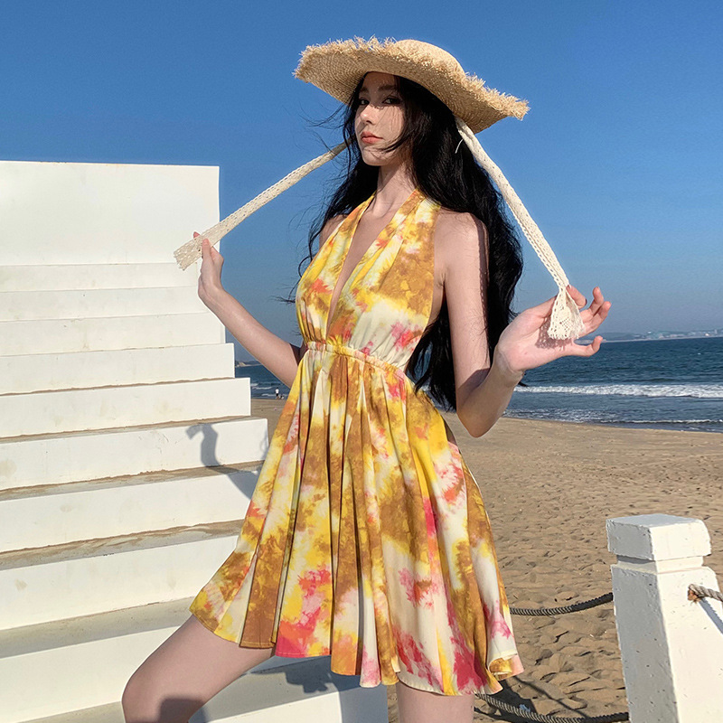 黄色碎花挂脖连衣裙性感露背夏季新款辣妹风裙子