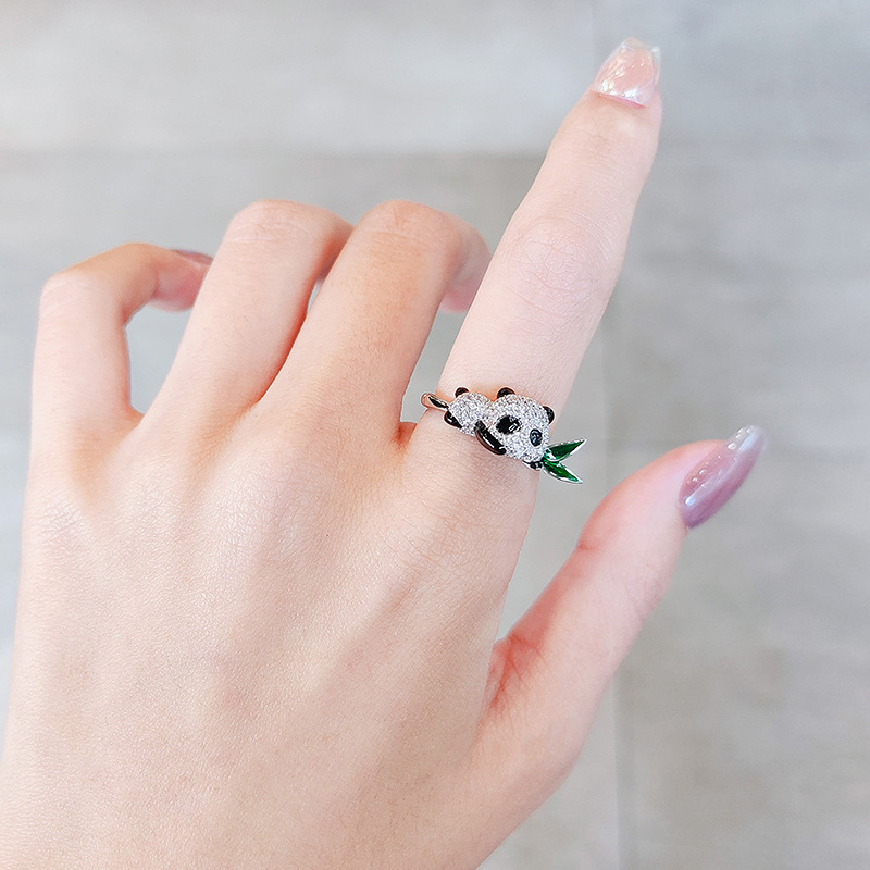 国风可爱熊猫竹叶戒指女新款小众设计感开口戒指食指戒指环