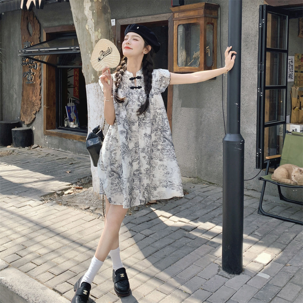 国风水墨画新中式连衣裙女夏新款复古盘扣小飞袖碎花度假裙子