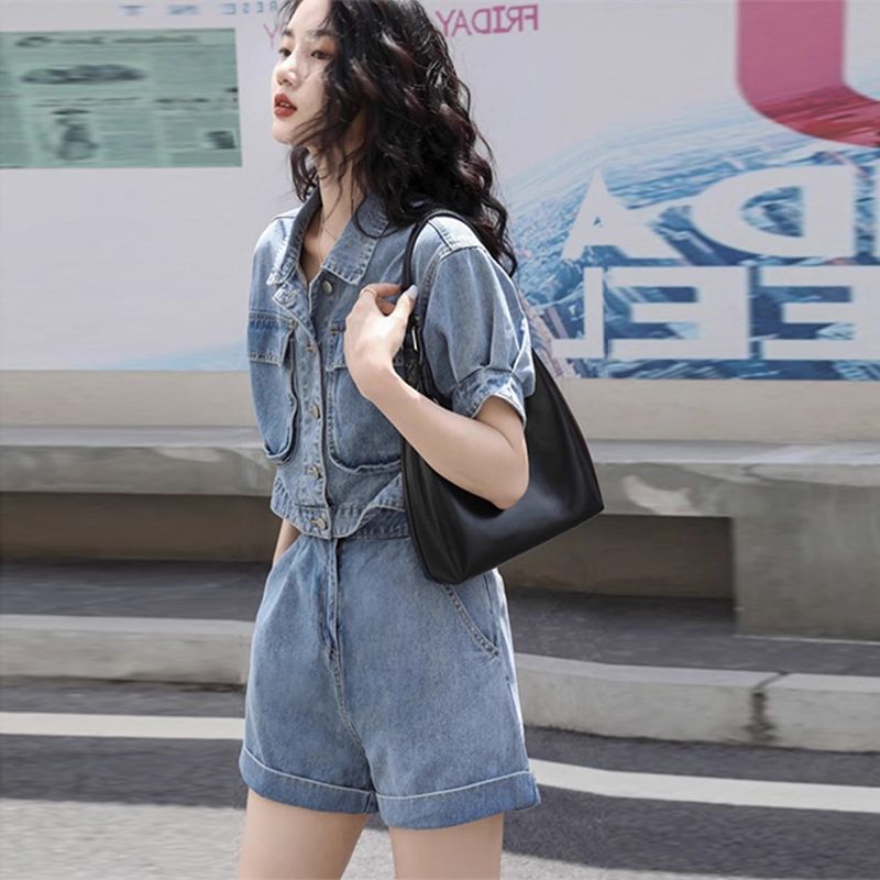 减龄气质设计感牛仔套装女夏季大码胖mm短款衬衫外套短裤子两件套