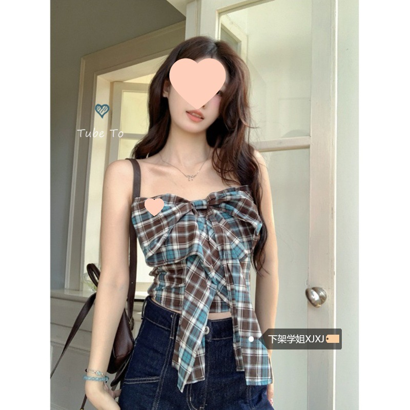 性感格纹蝴蝶结抹胸女夏季新款设计感露背修身辣妹一字肩上衣