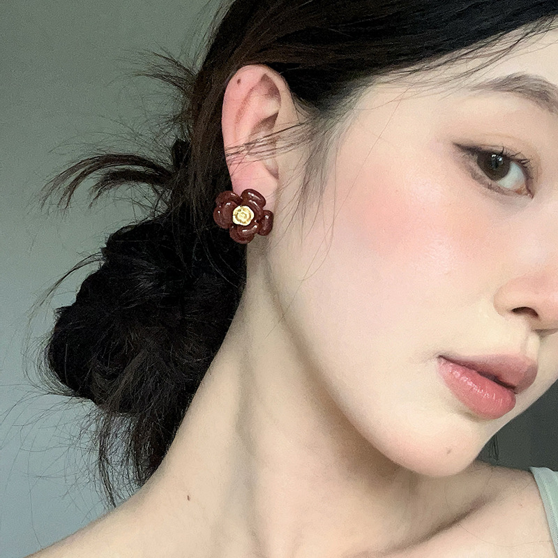 彩色滴釉立体山茶花耳钉气质高级感小香风耳环高级感红色珐琅耳饰