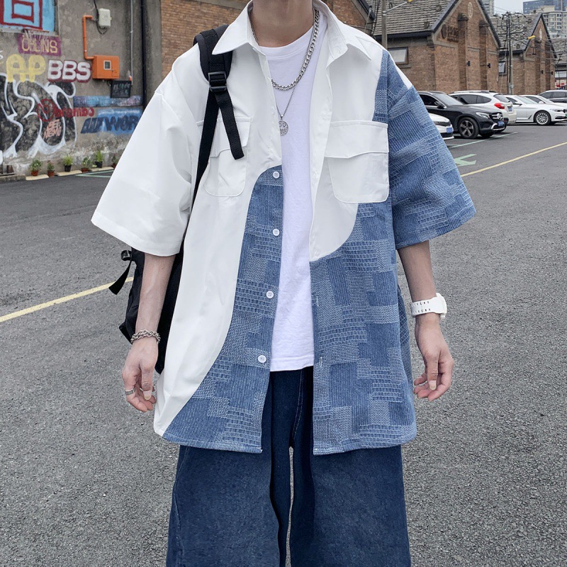 男五分袖新款原宿夏季时尚标准潮流青春流行翻领衬衫拼色气质衬衣