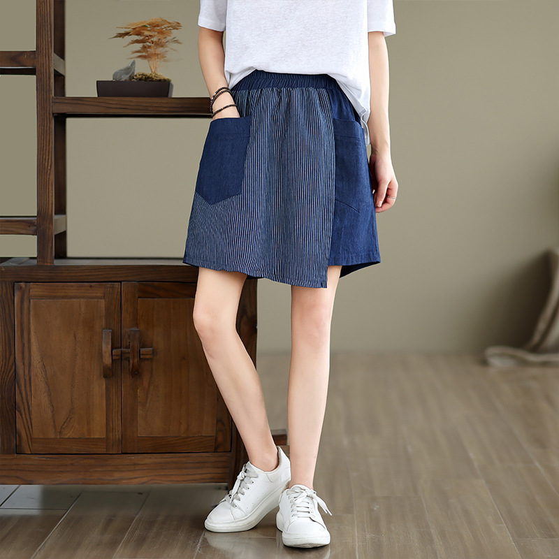 大码女装夏款复古百搭条纹牛仔裤显瘦不规则宽松裙裤