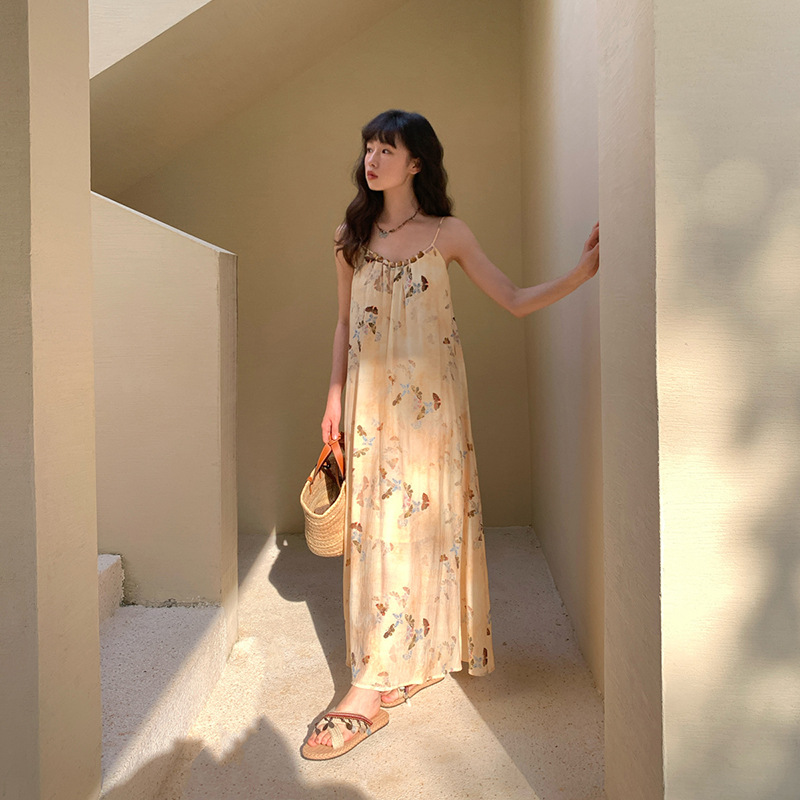 夏季中式水墨印花温柔气质显瘦吊带连衣裙