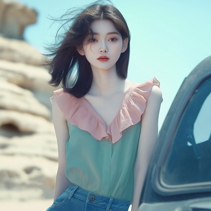 初夏流行漂亮设计感上衣小众法式甜美遮肚显瘦绿色小飞袖V领衬衫