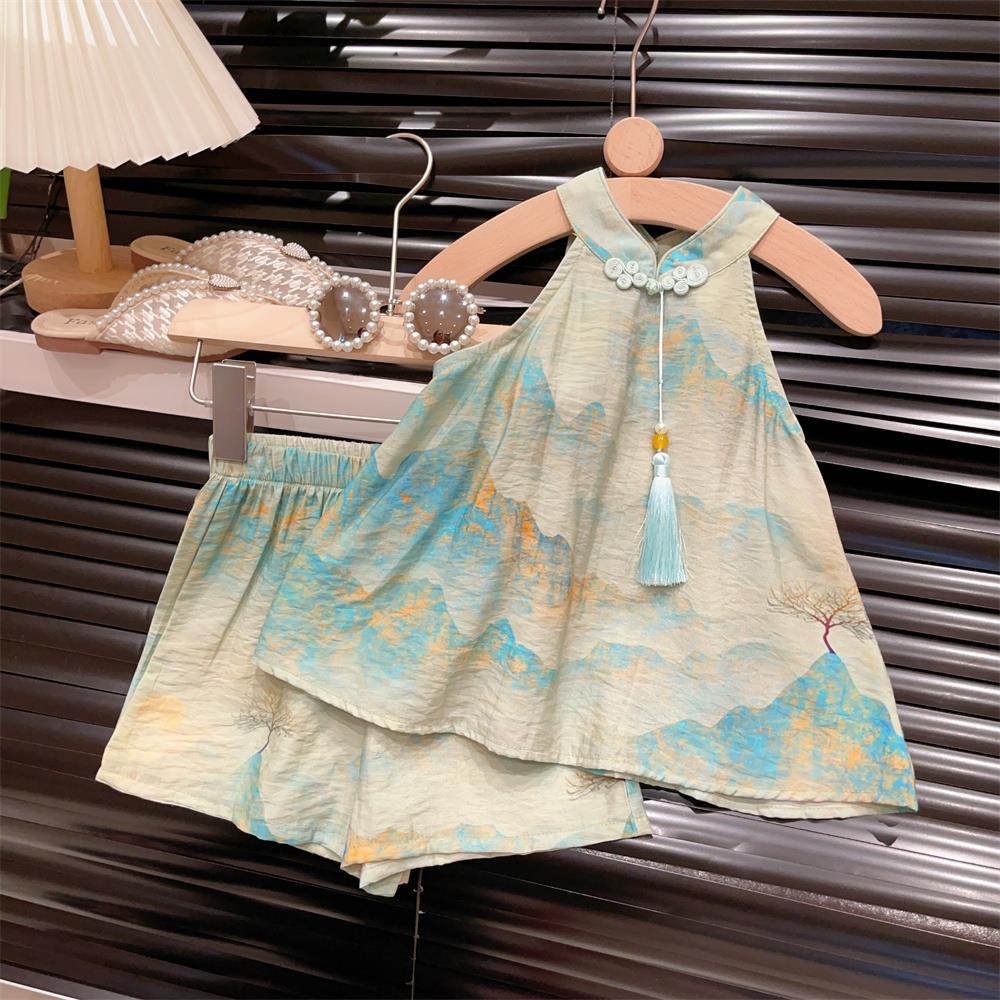 新品女童国风山水画盘扣圆领娃娃裙衫短裤两件套2025夏装套装