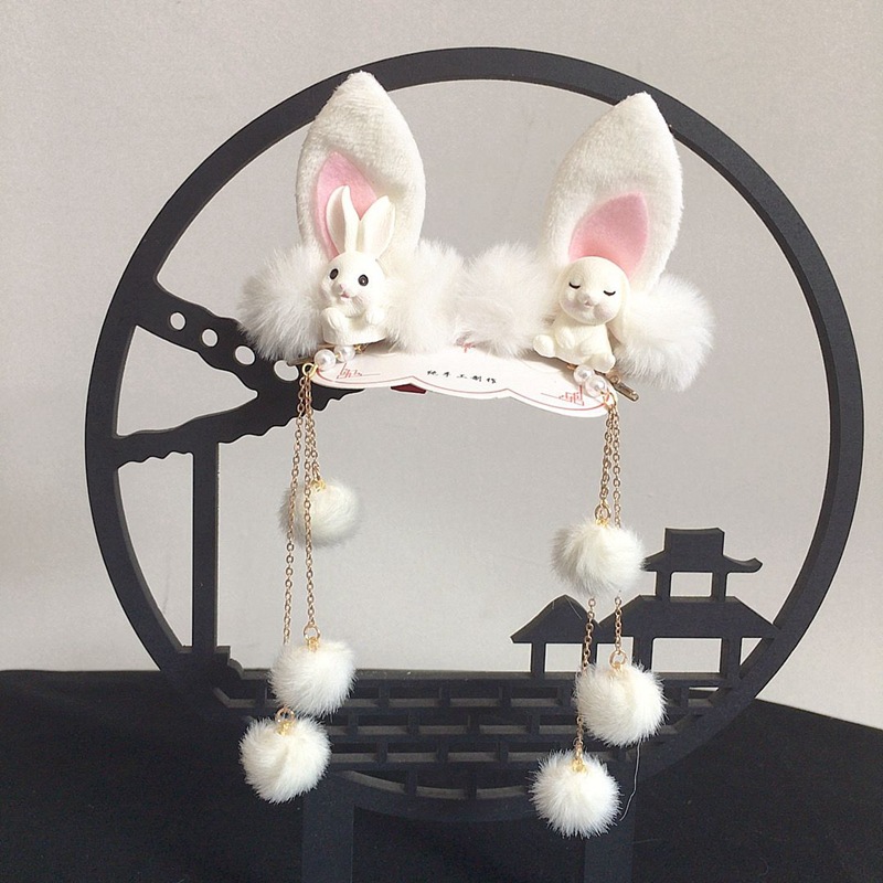 儿童汉服发夹古风发饰兔耳女童可爱仙气女孩毛绒兔耳发卡头饰中秋