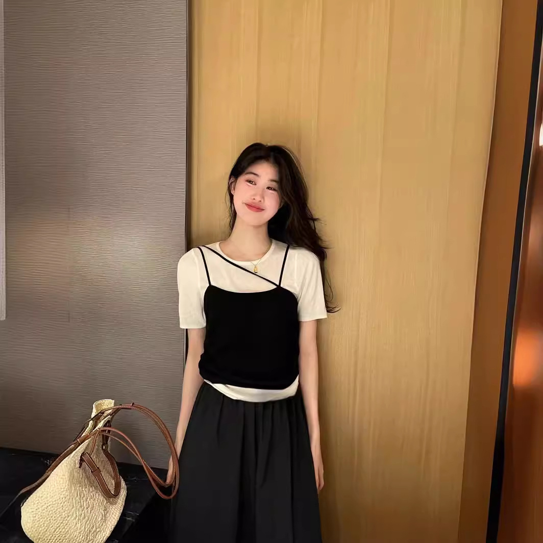 韩系撞色拼接假两件短袖t恤女夏新款设计感绝美冰丝针织上衣