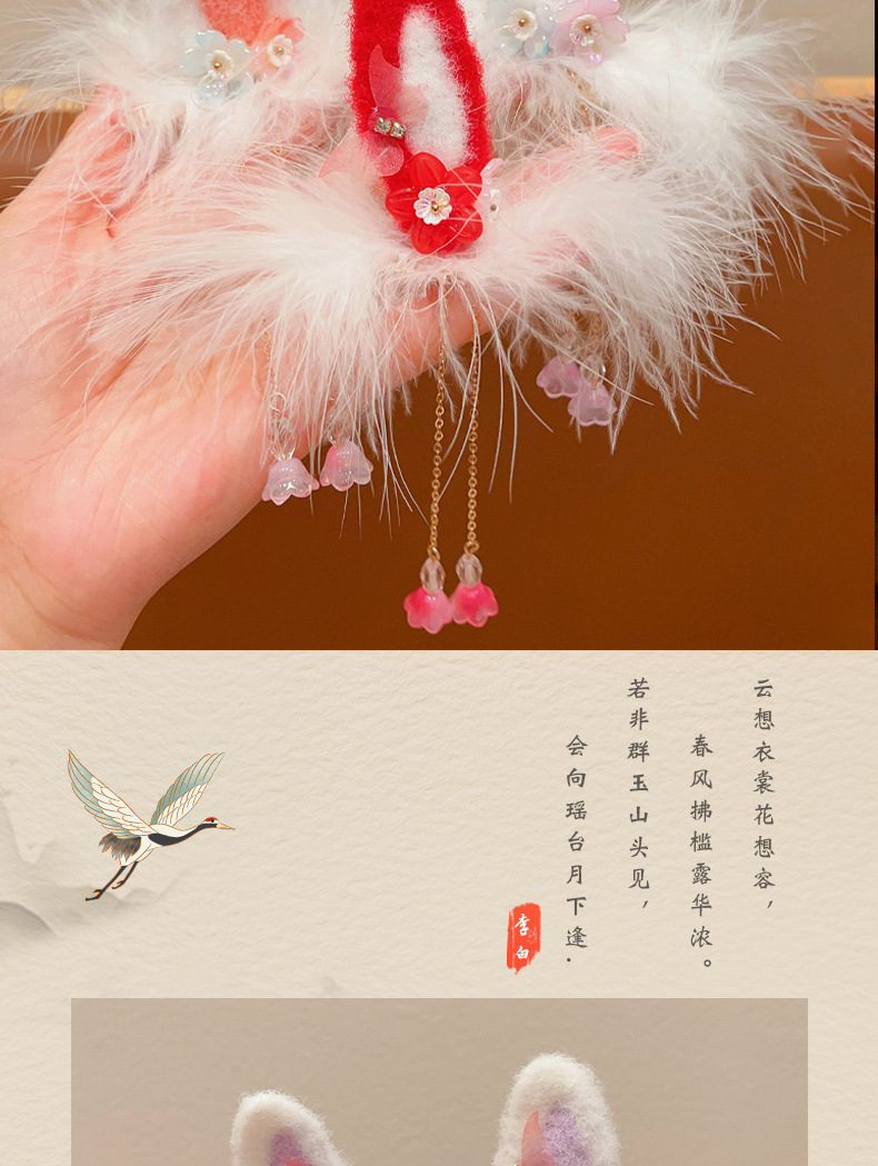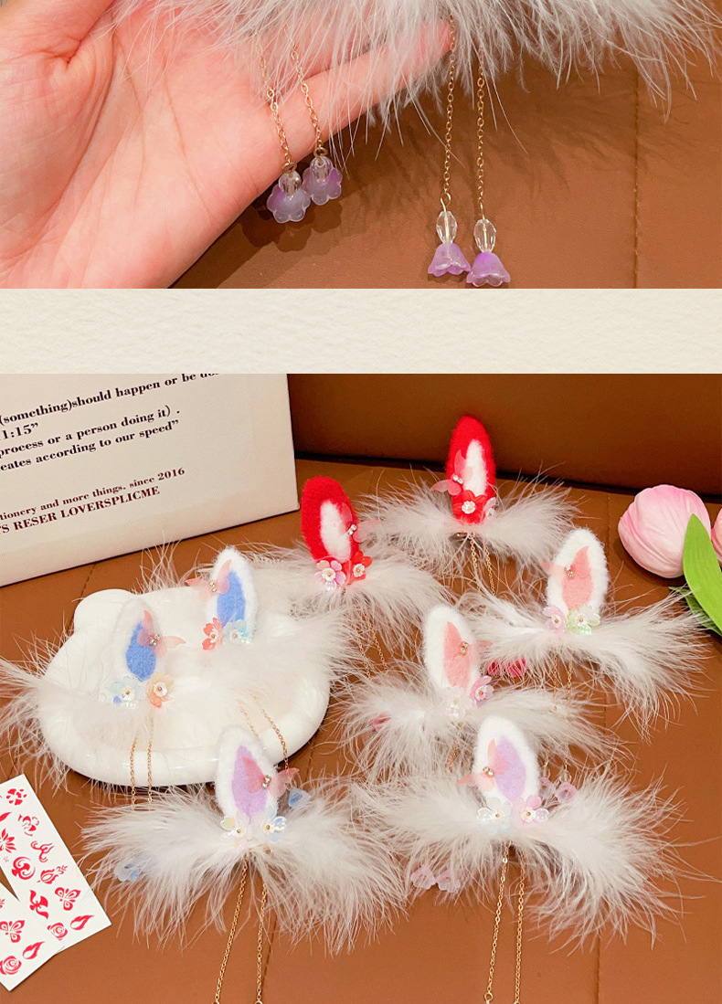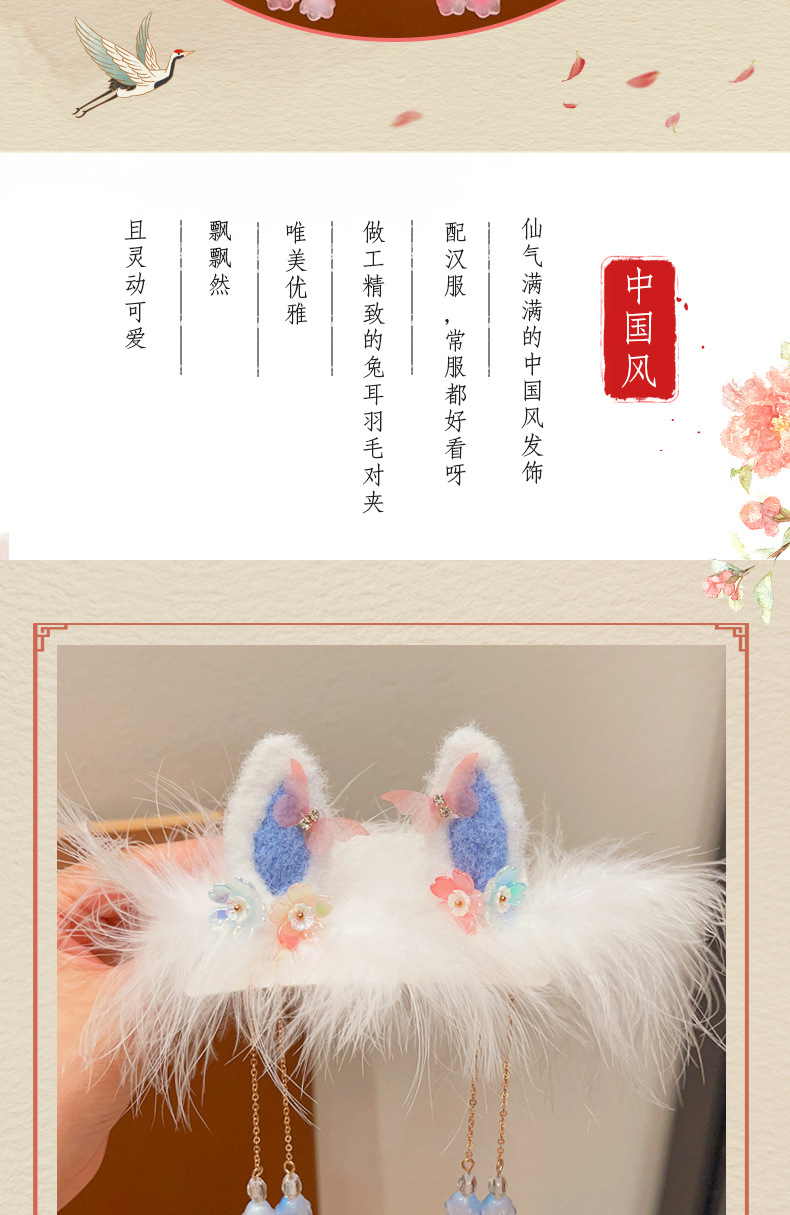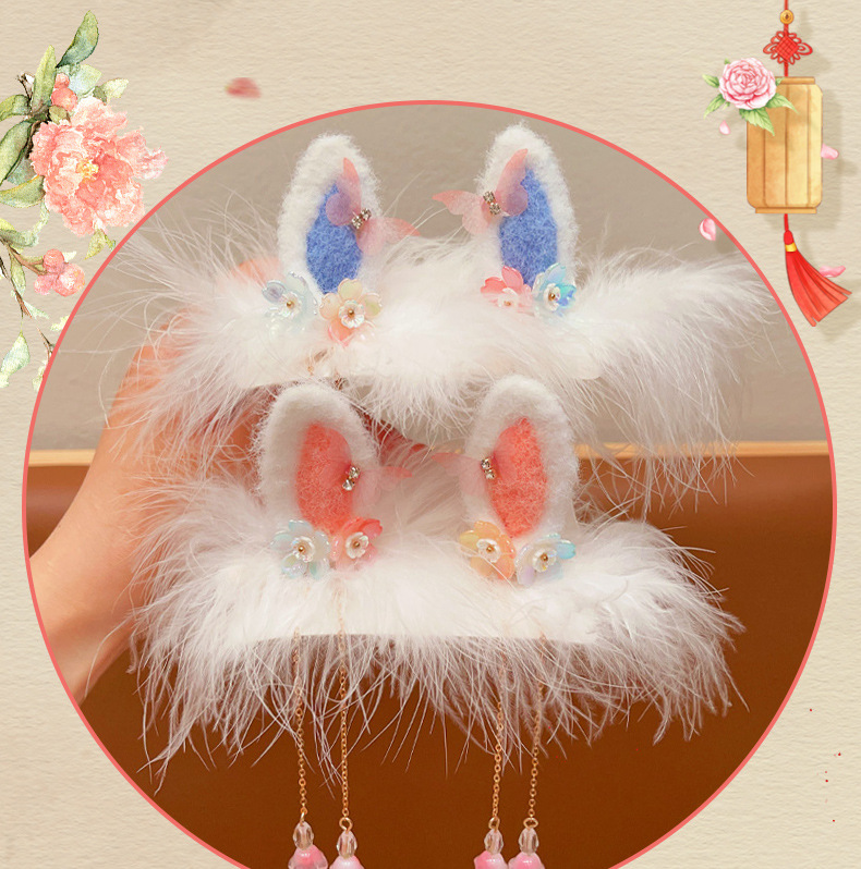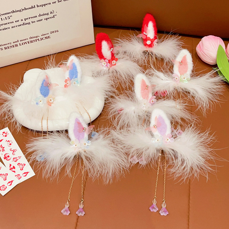 古风发夹儿童毛绒立体兔耳发卡女童中国风流苏夹女孩羽毛可爱顶夹