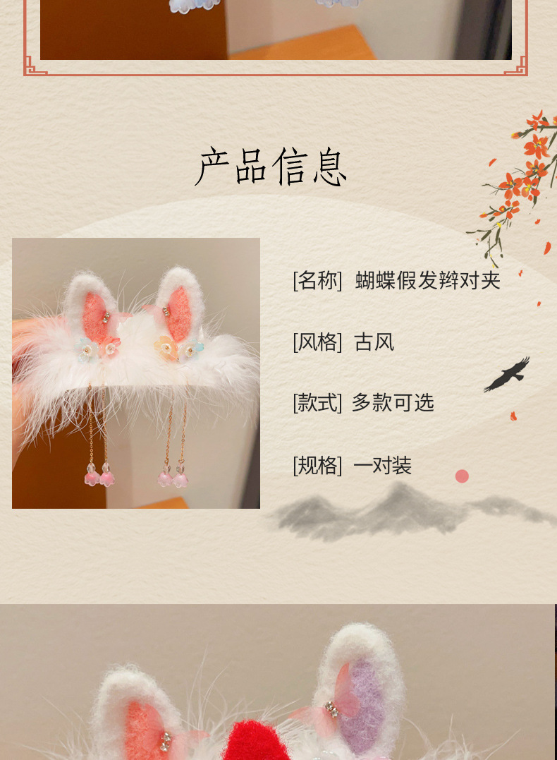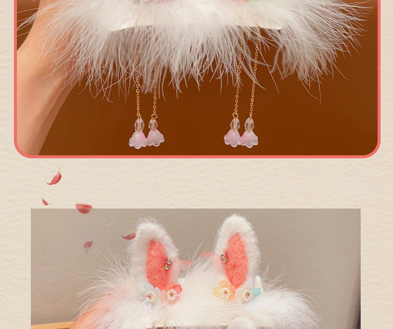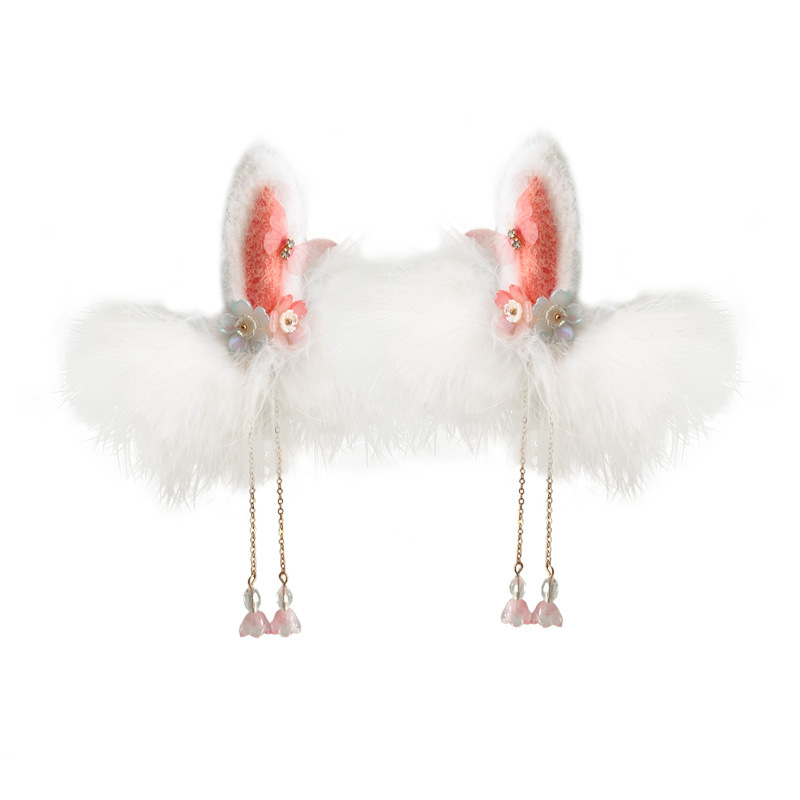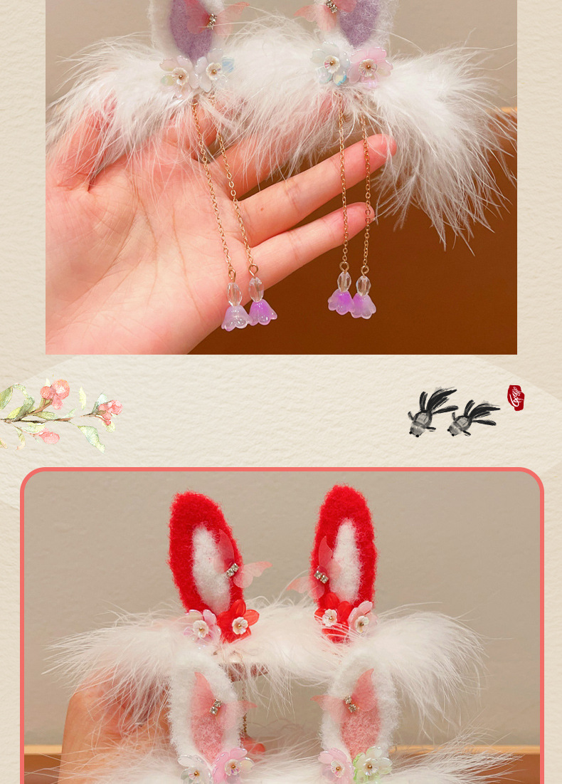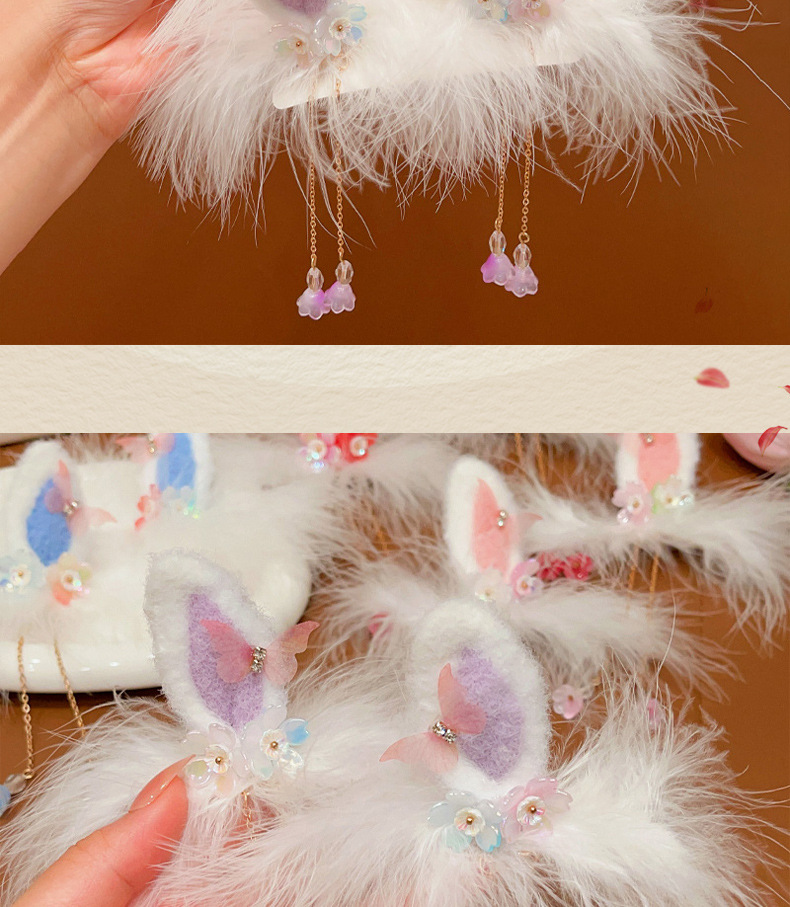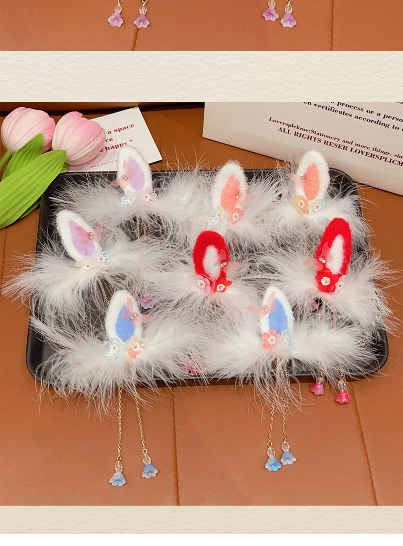 古风发夹儿童毛绒立体兔耳发卡女童中国风流苏夹女孩羽毛可爱顶夹