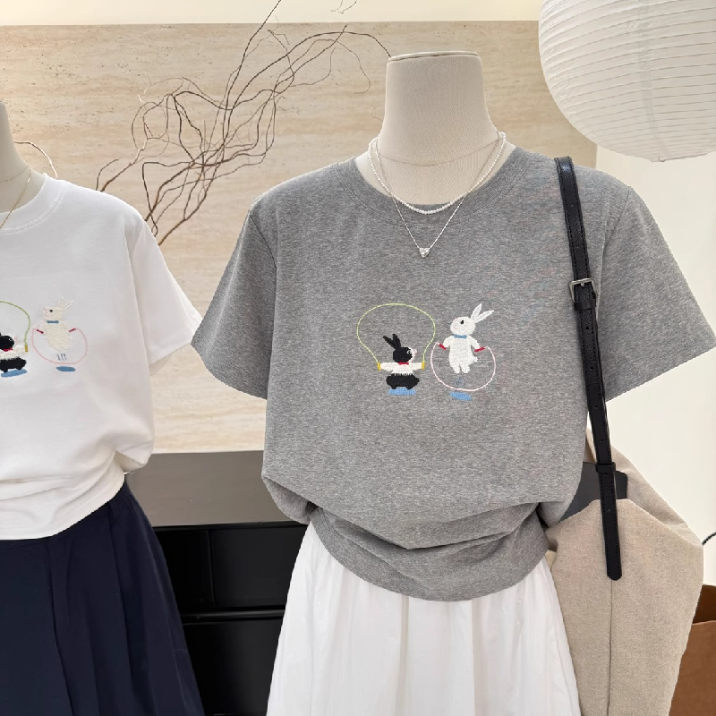 夏季新款短袖跳绳小兔刺绣女生圆领打底t恤女宽松显瘦上衣体恤潮