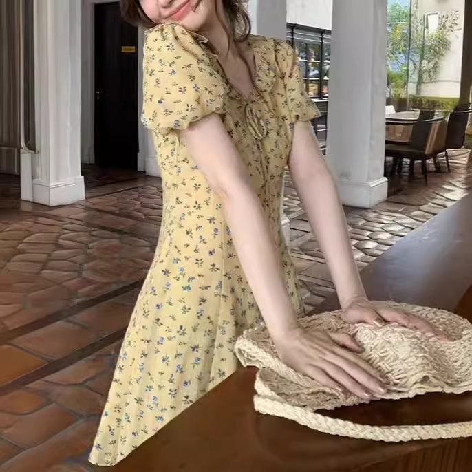 荷叶边V领绑带碎花连衣裙女新款收腰中长款a字裙