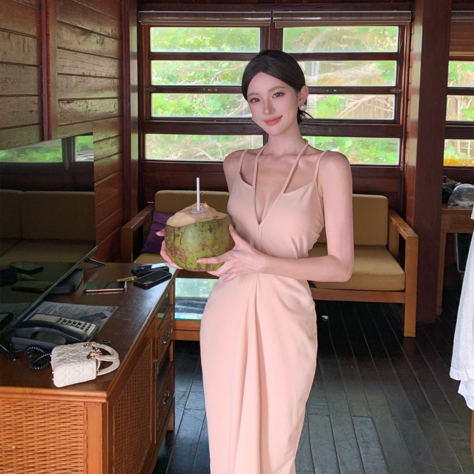 气质深V垂坠收腰立裁挂脖露背吊带连衣裙