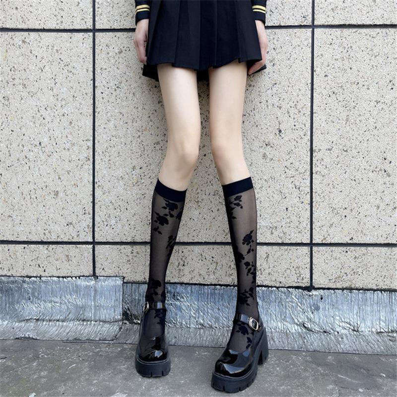 玫瑰花暗黑丝袜女薄款ins潮lolita日系jk中筒袜子春夏季长筒白色