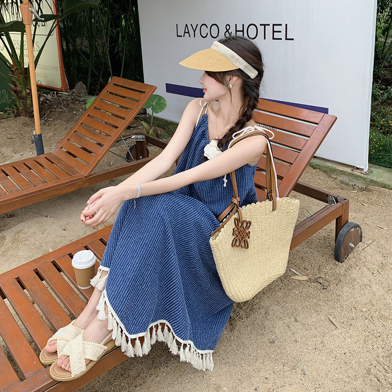 法式流苏吊带连衣裙牛仔夏季新款显瘦不规则宽松长裙气质裙子