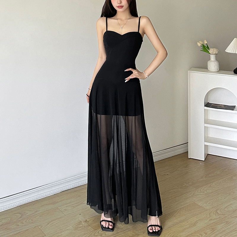 欧美风夏季新款女装纯欲裹胸网纱拼接收腰超大摆连衣裙