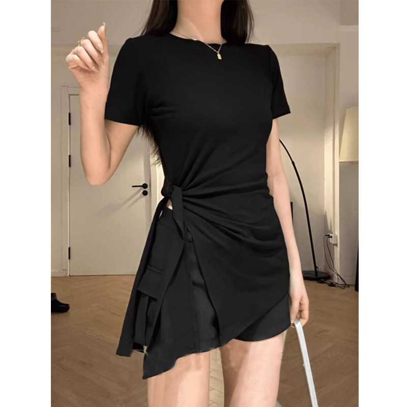 黑色圆领正肩短袖T恤女夏季设计感侧开叉修身收腰绑带中长款上衣