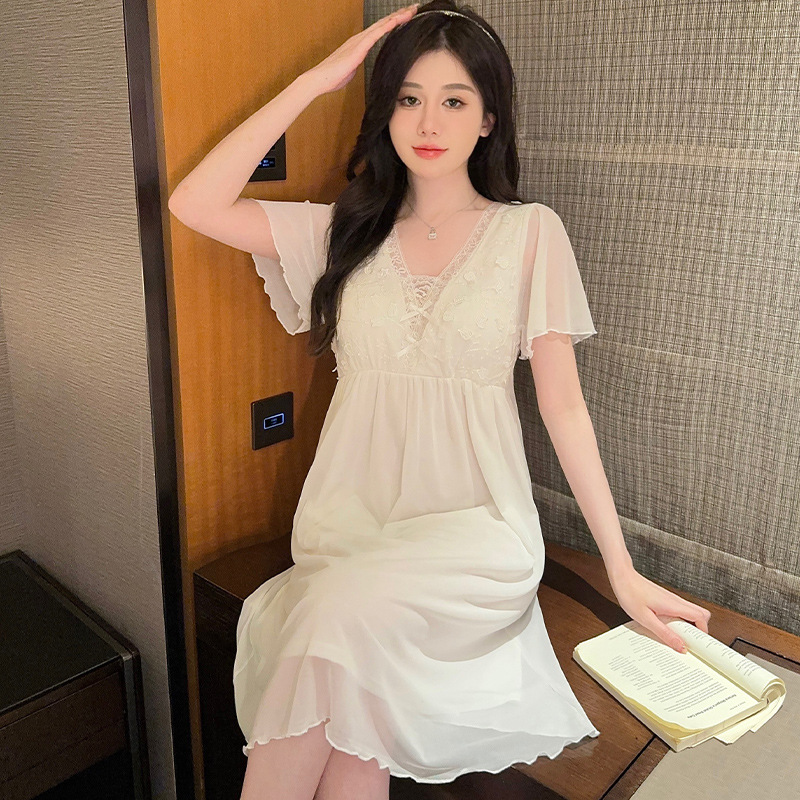 女士网纱蕾丝睡裙夏季薄款短袖莫代尔甜美仙女风带胸垫中裙家居服