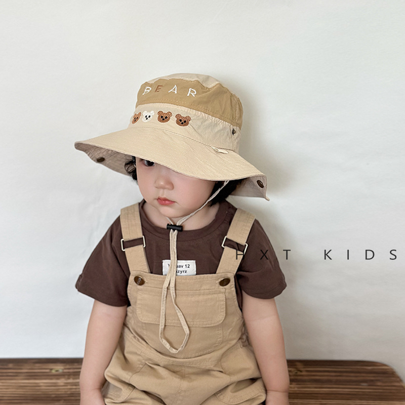 儿童防晒帽夏季薄款拼色小熊刺绣大帽檐遮阳帽子宝宝户外登山帽春