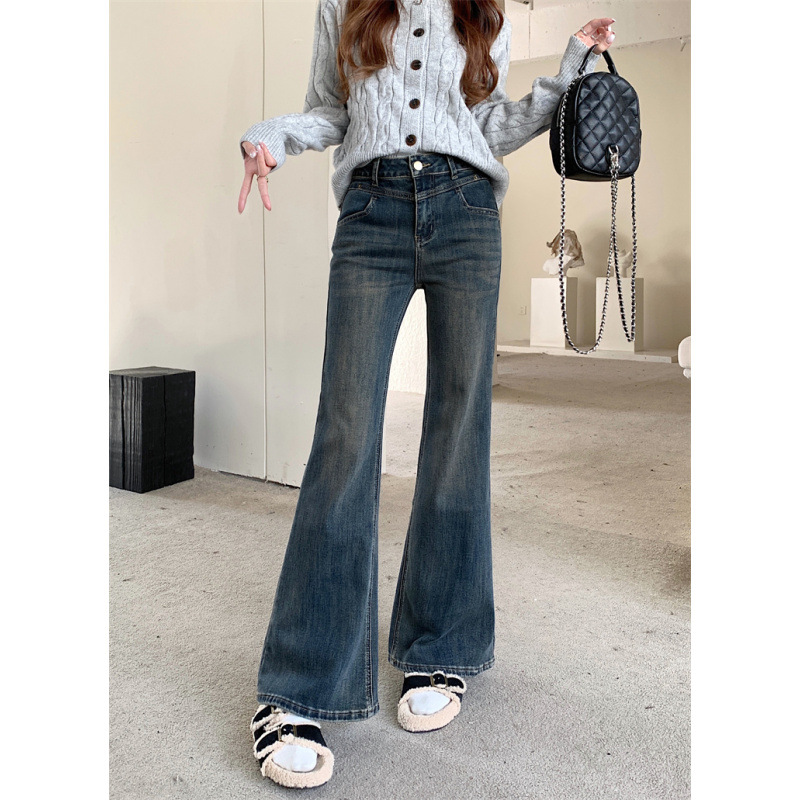 美式复古微喇牛仔裤女高腰修身显瘦弹力拖地长裤