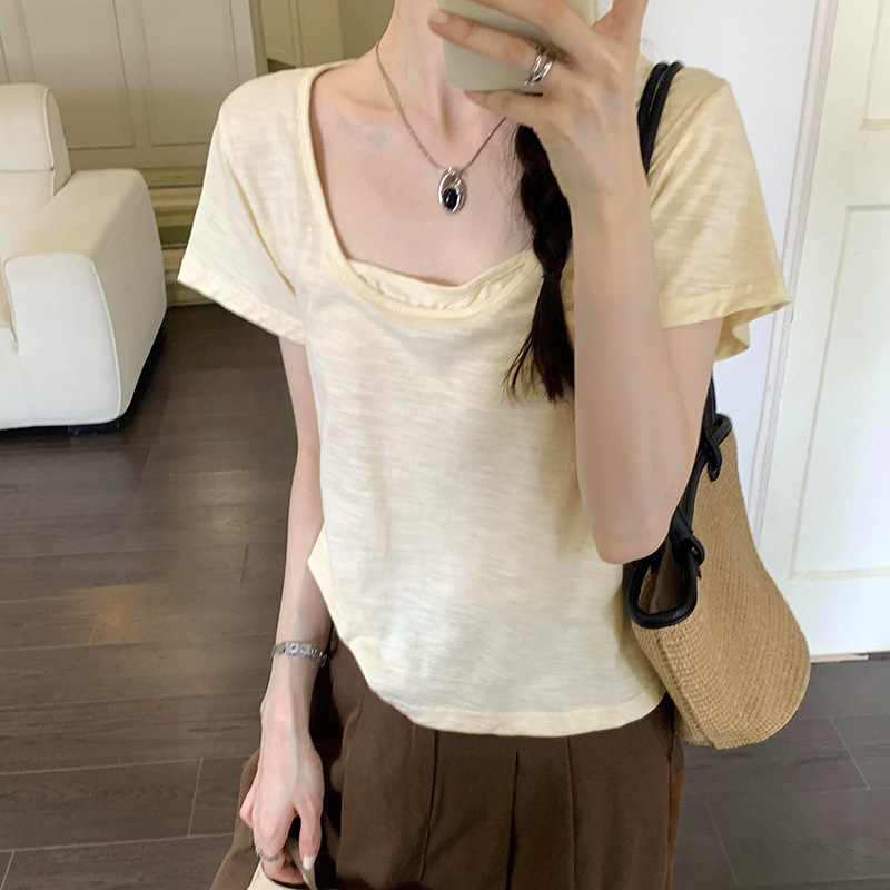 假两件设计感竹节纯棉短袖T恤女夏季新款亲肤柔软正肩短上衣