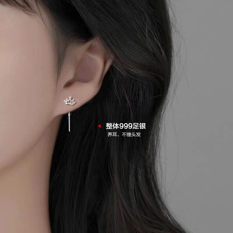 S999足银皇冠耳线女轻奢小众设计简约耳环养耳洞洗睡免摘耳骨耳饰