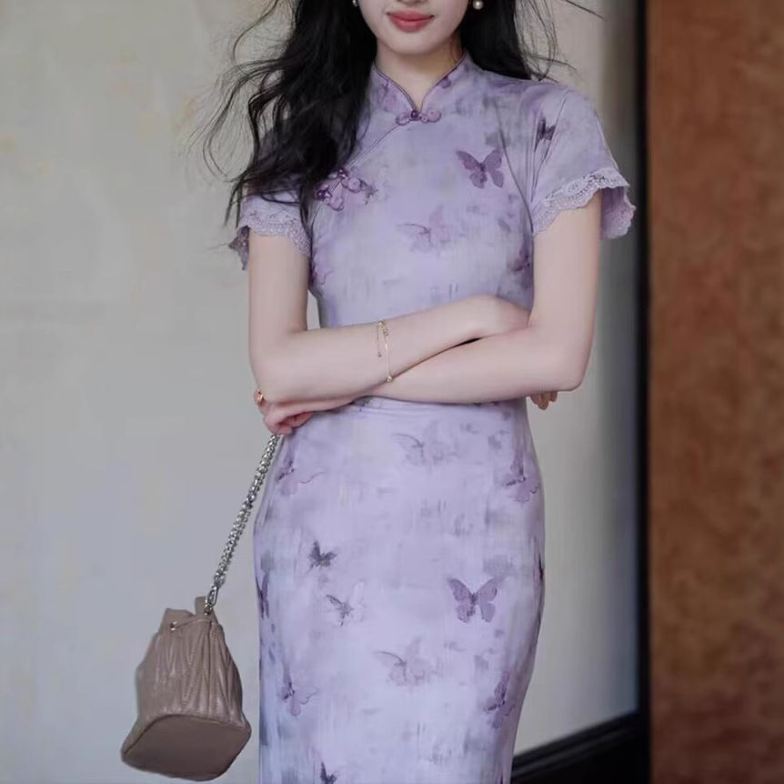 TYANG贰羊设计梦蝶国风新中式紫色蝴蝶旗袍连衣裙