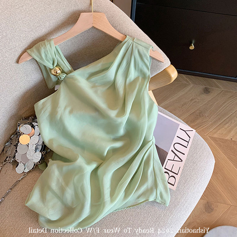 薄荷绿不规则单肩无袖衬衫女夏季新款法式设计感气质显瘦褶皱背心