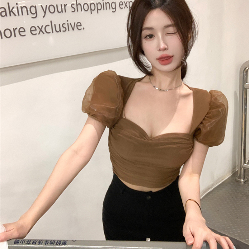 跨境i法式网纱泡泡袖衬衫夏季甜辣风方领短袖修身上衣女T恤
