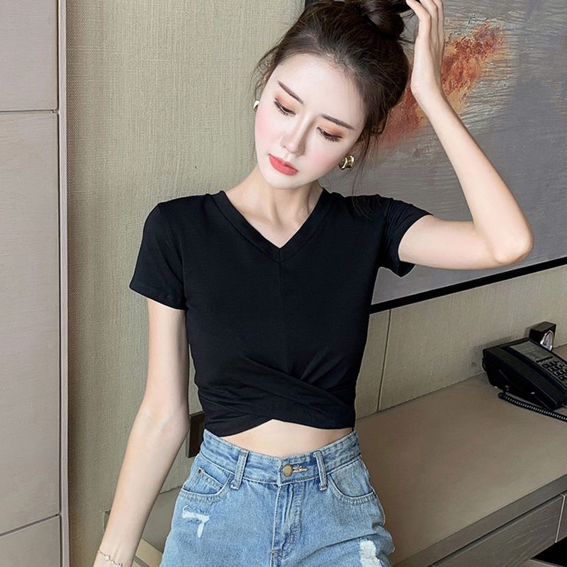 黑色短款t恤女短袖收腰设计感小众ins潮紧身爵士舞高腰露脐上衣夏