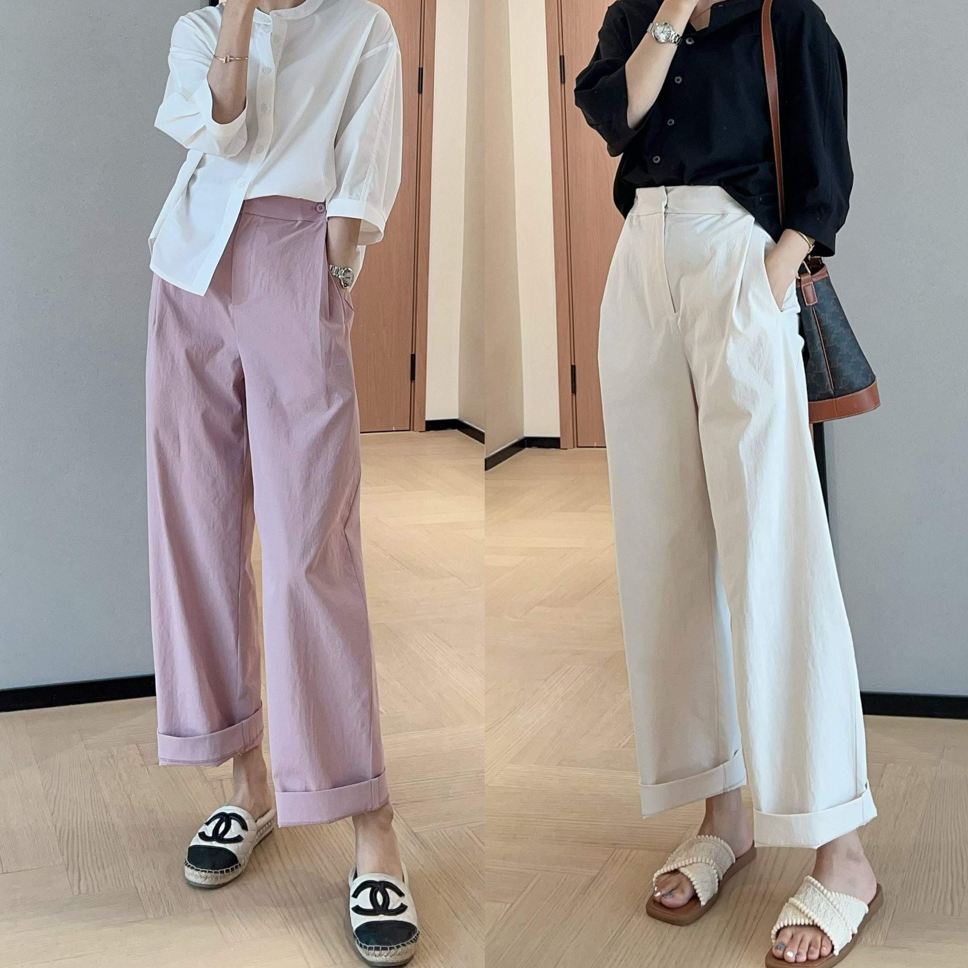 WTHEONE超态棉微皱折纸工装休闲裤宽松显瘦直筒阔腿裤女春夏新款